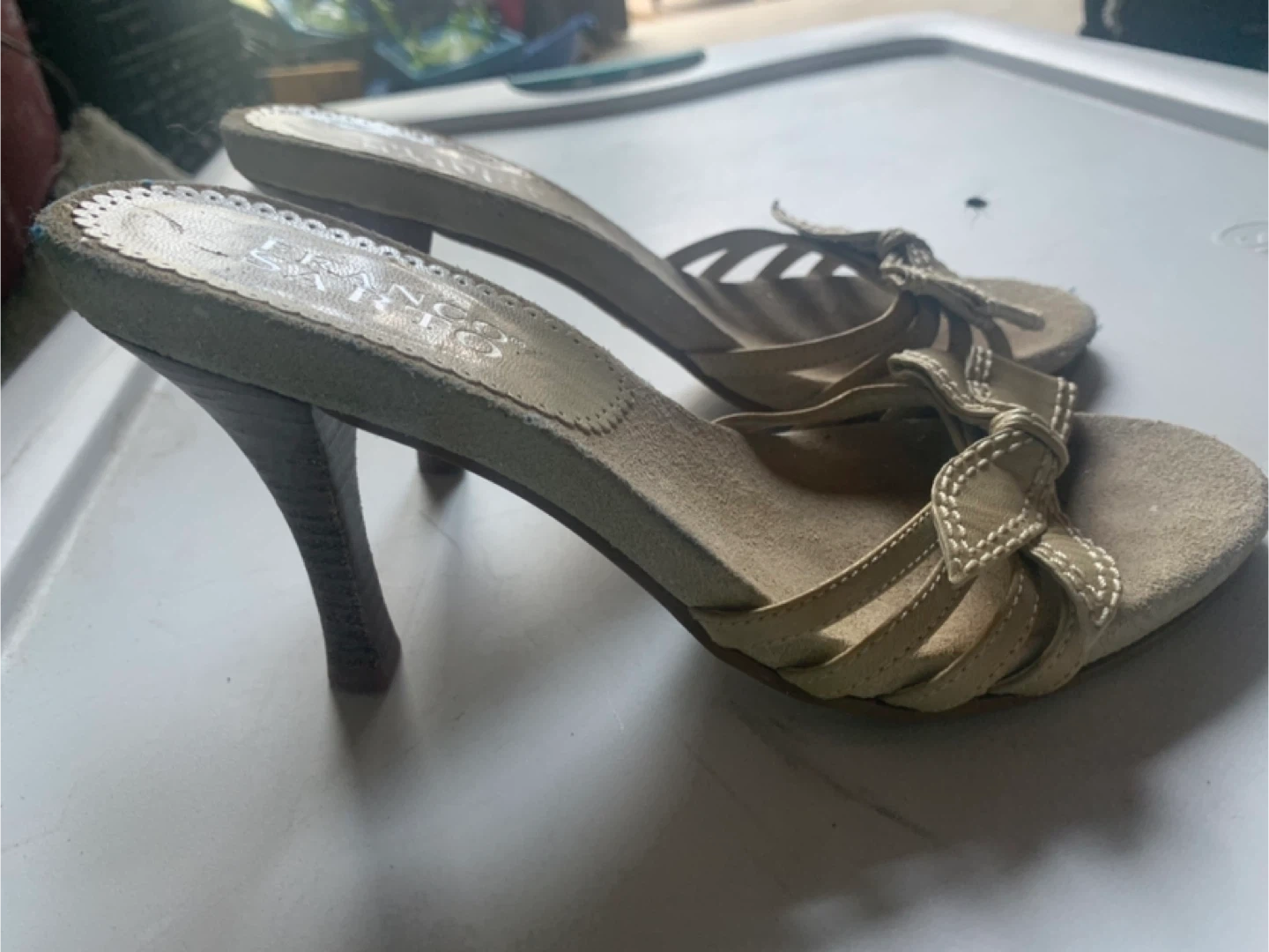 Selling a pair of Franco Sarto heels in a beige colour. They are size 5 and made with a leather upper and man-made sole. They have a cute bow detail on the front!