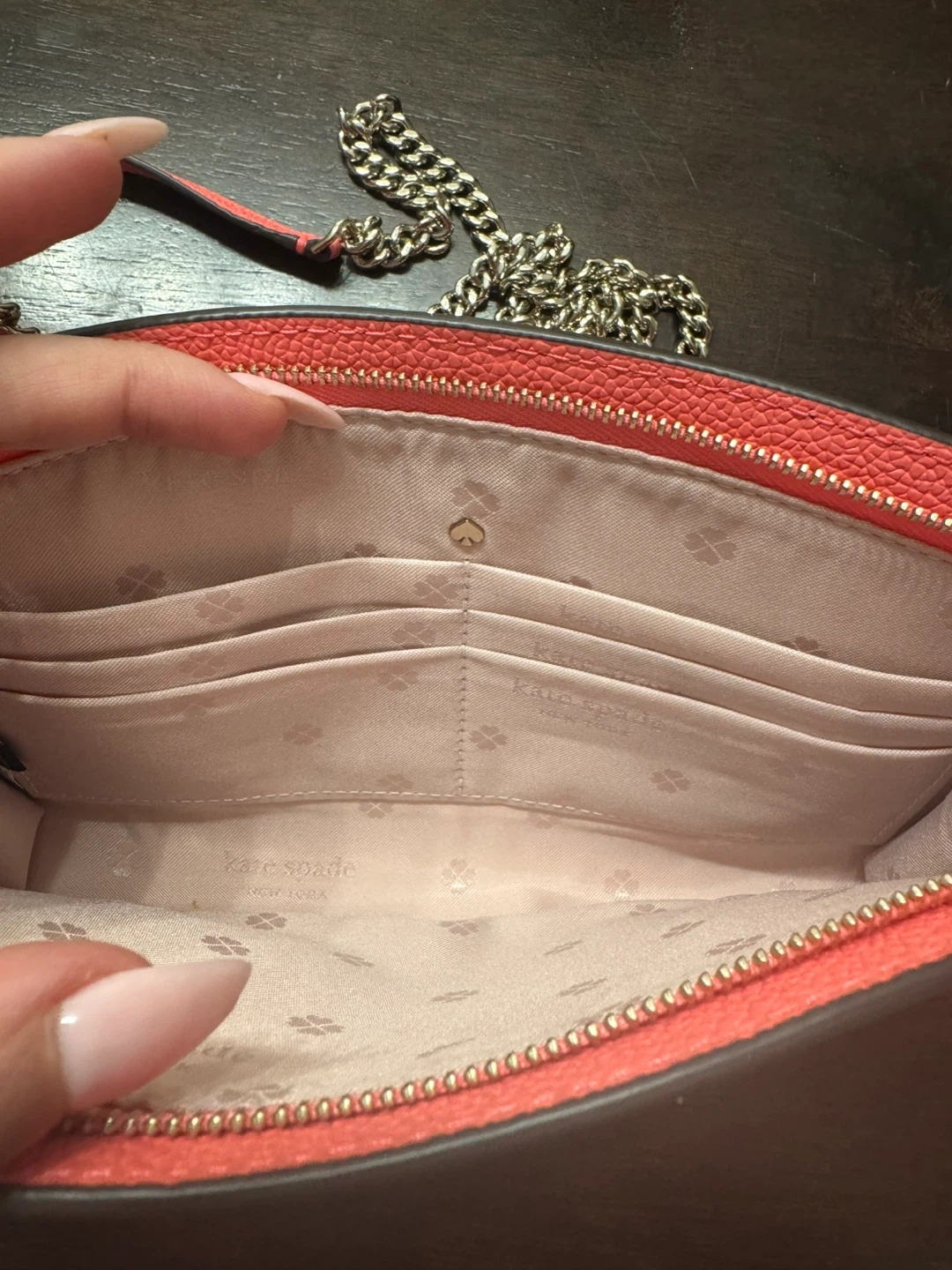 Selling a cute Kate Spade crossbody bag! It's a beautiful coral color and in great condition. It comes with a chain strap and has several compartments inside