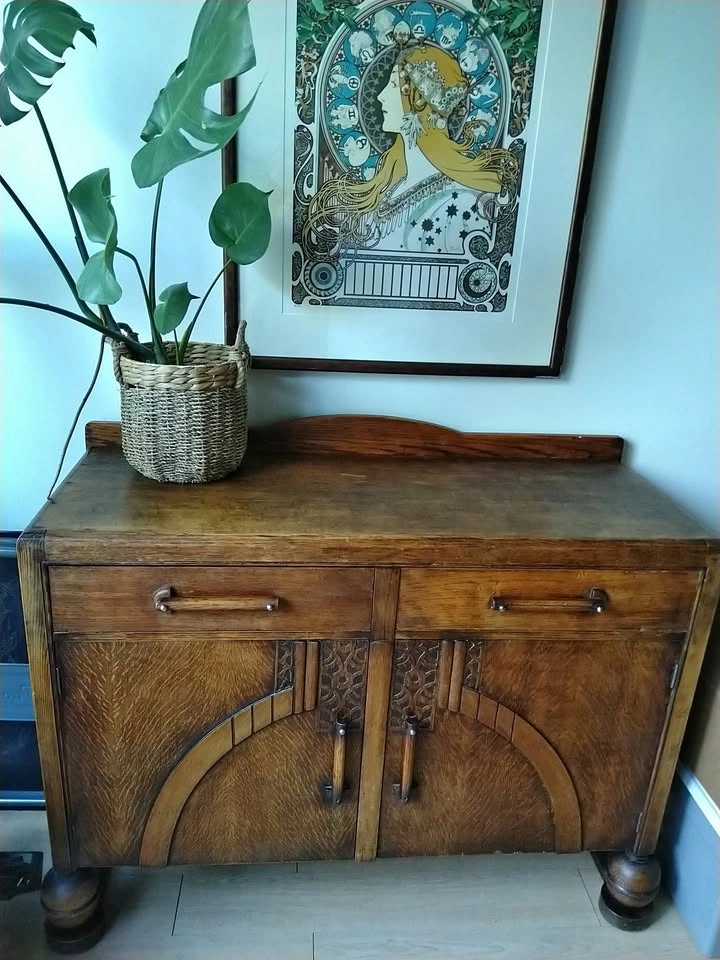 Art Deco 1930's Oak sideboard cabinet. Beautiful wood grain and detailing, felt lined cutlery drawer. Well built, sturdy, yet not heavy.