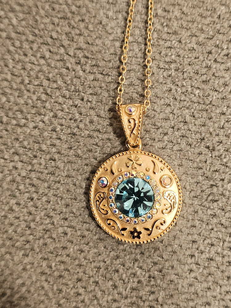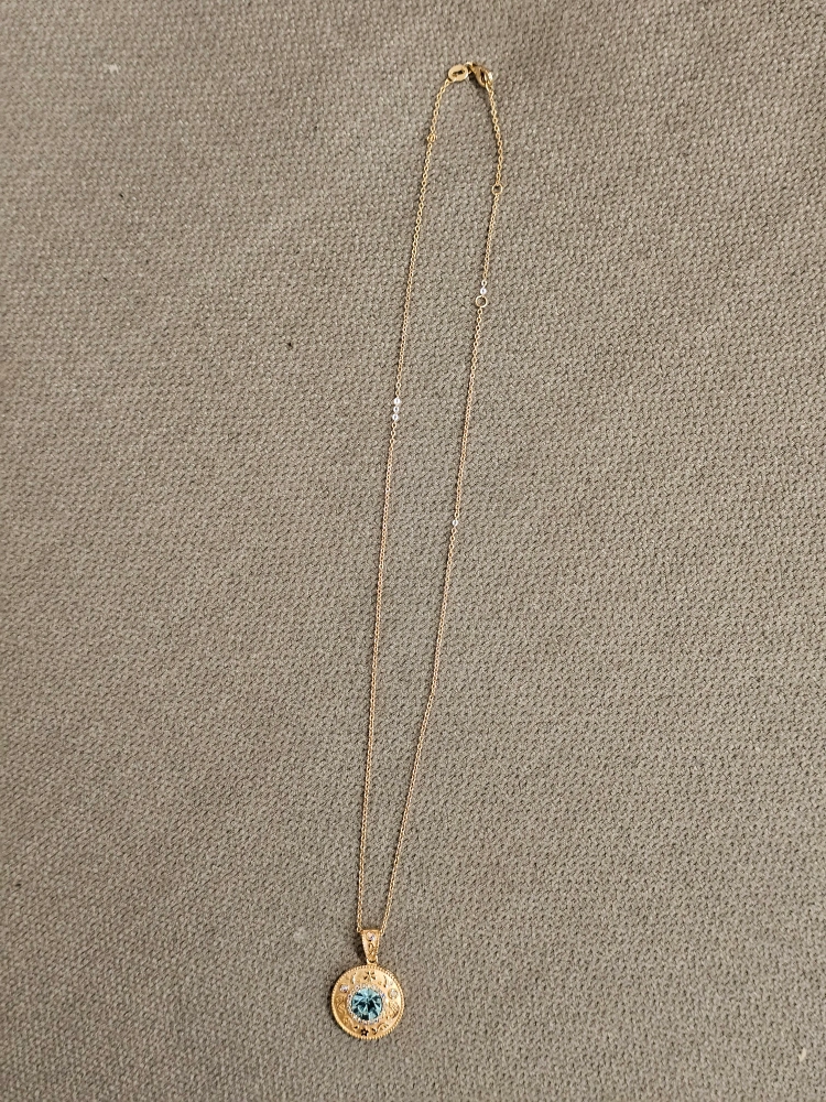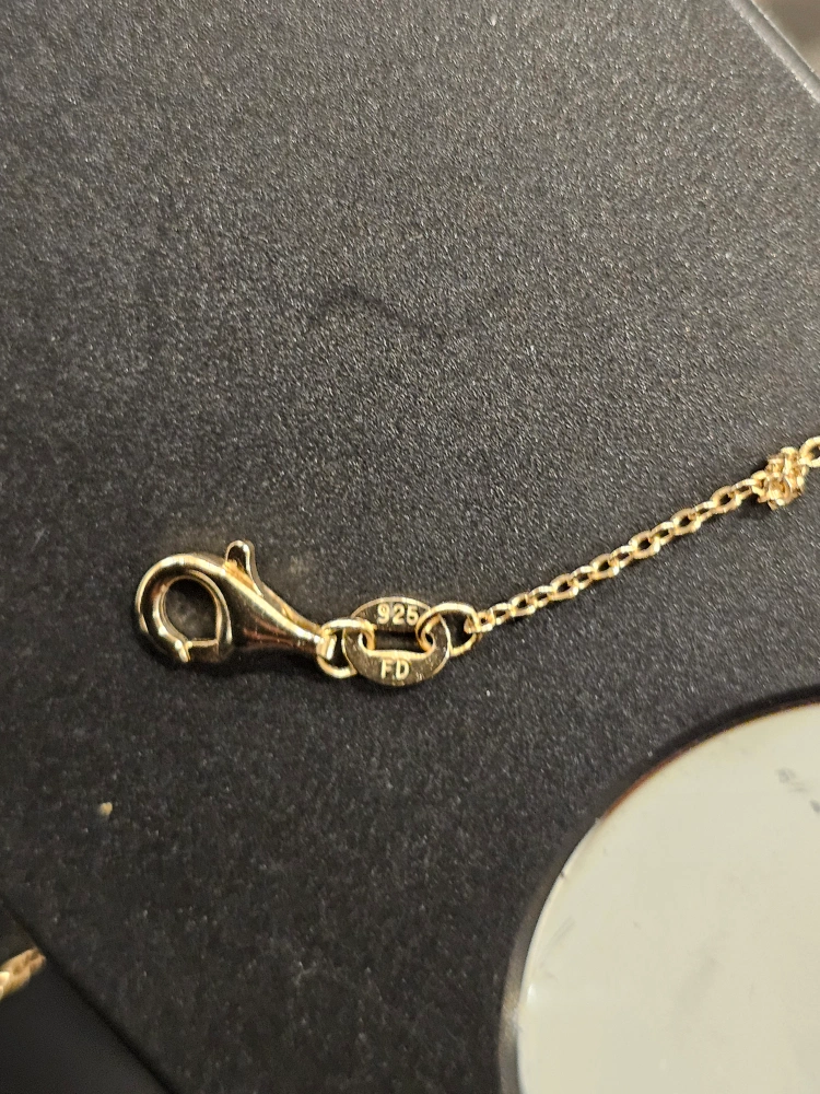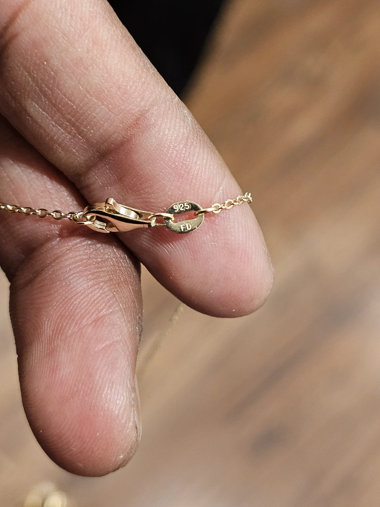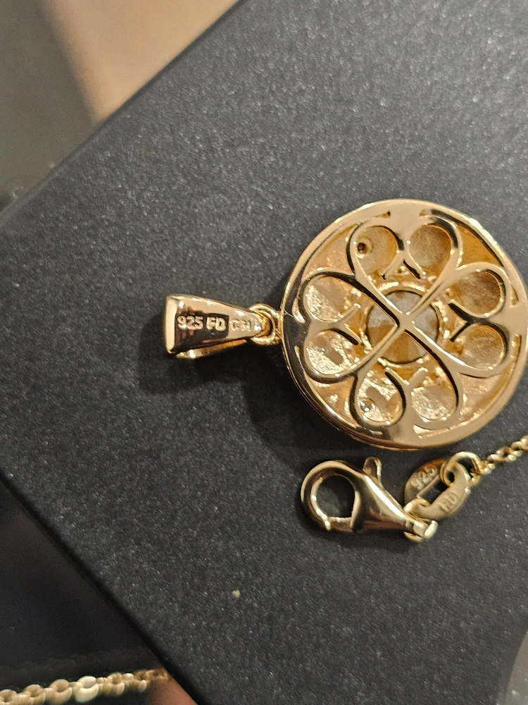Selling a beautiful sterling silver gold plated necklace featuring a unique blue stone pendant. The necklace is stamped with '925' indicating it's made of sterling silver with gold plating. The pendant has an intricate design on the back. It's in great condition and ready to be worn!