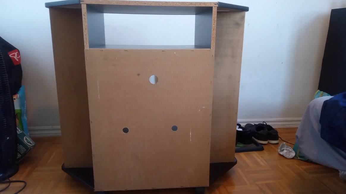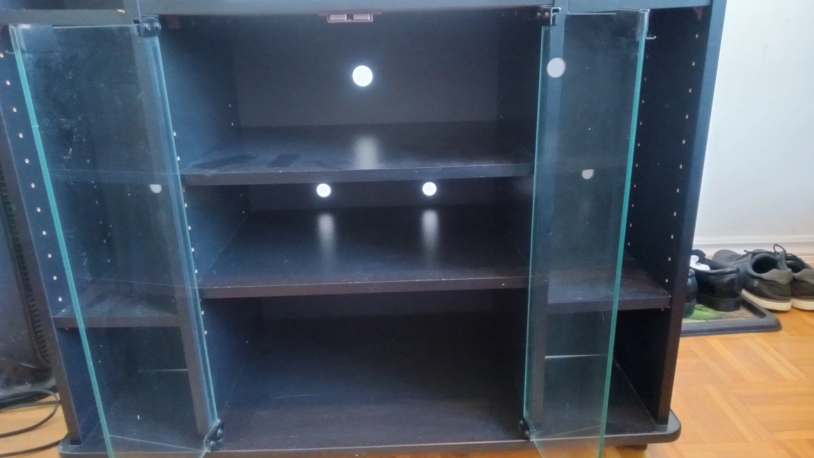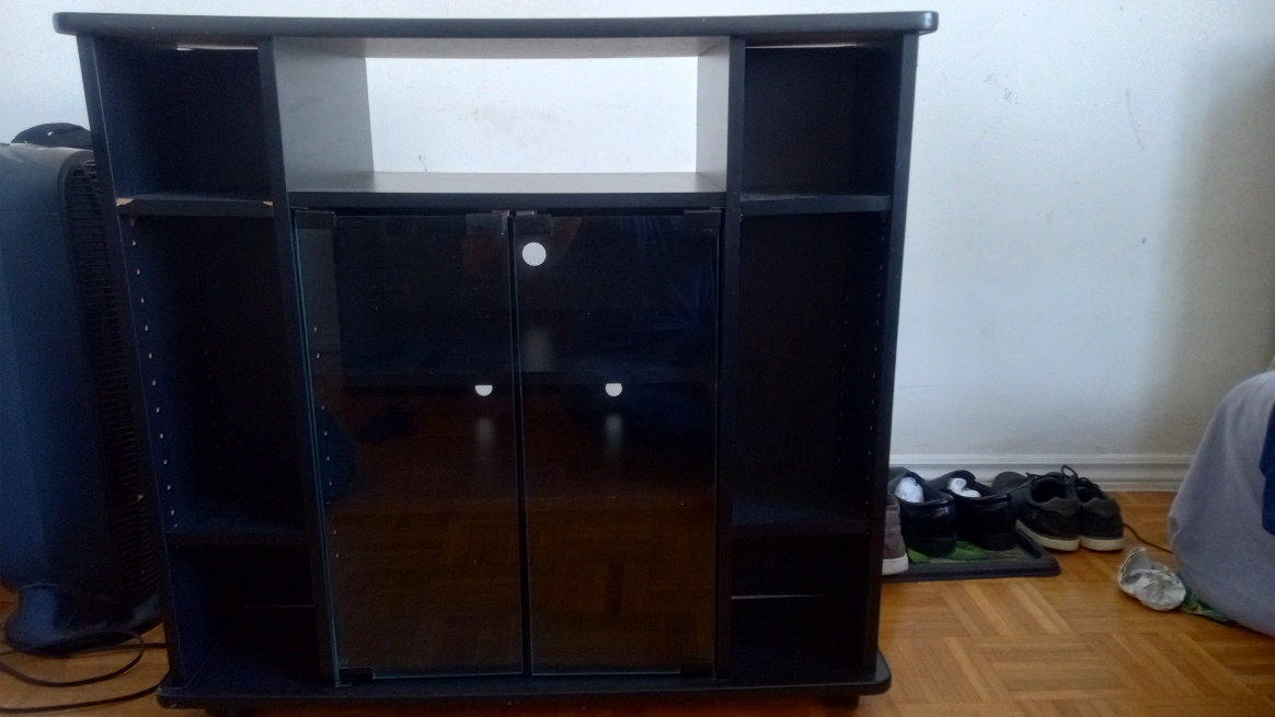 Selling a black TV stand with glass doors. It has some wear and tear, as you can see in the photos, but it's still a functional piece of furniture. It offers ample storage space with multiple shelves and compartments. Wheels underneath which makes it easily movable. OPEN TO OFFERS. Pick up Jarvis and Carlton.
