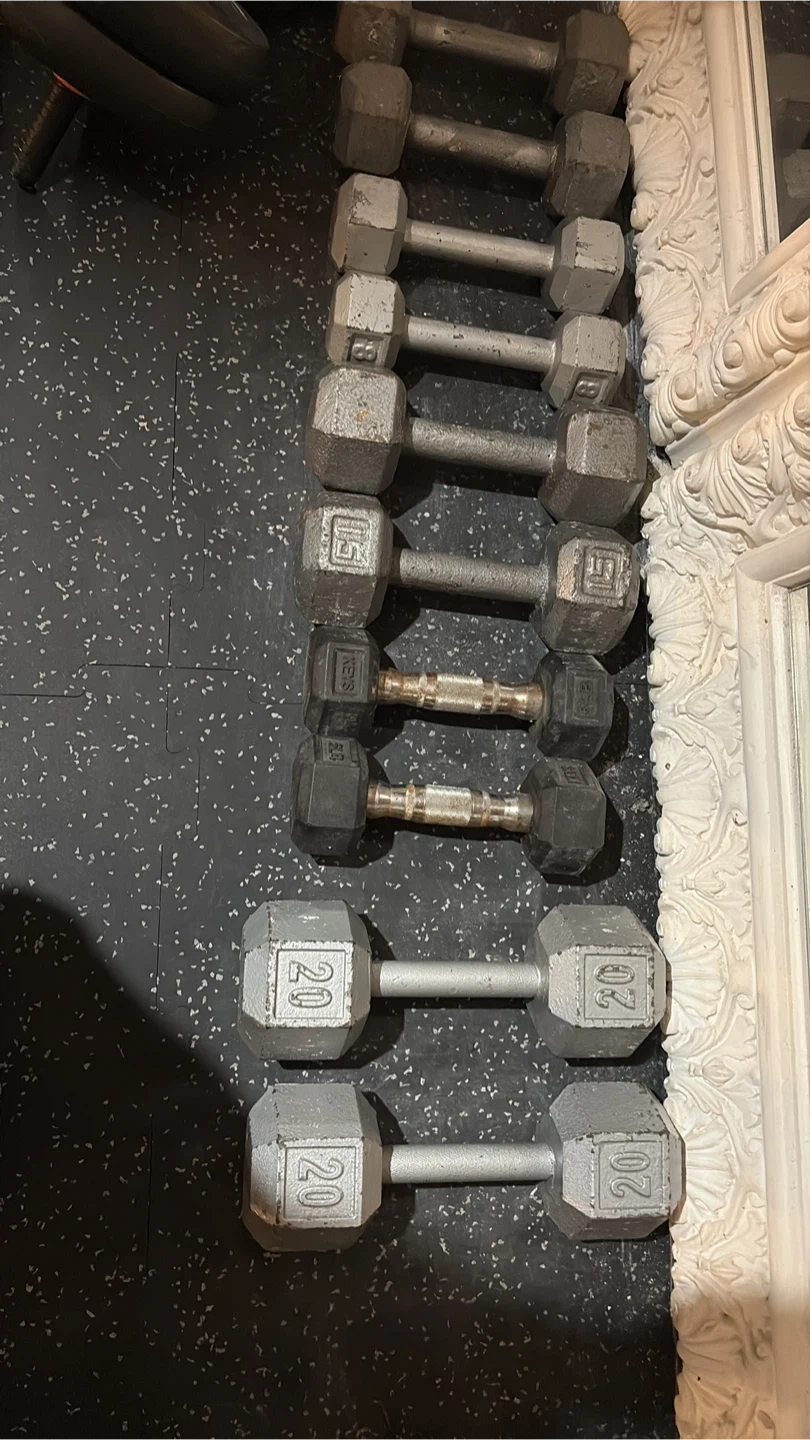 Set include: 2 * 5 lbs 4 * 8 lbs 2 * 5 lbs 2 * 15 lbs 2 * 20 lbs