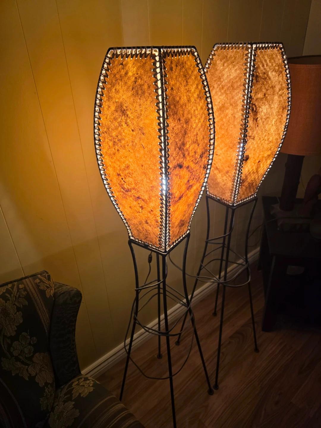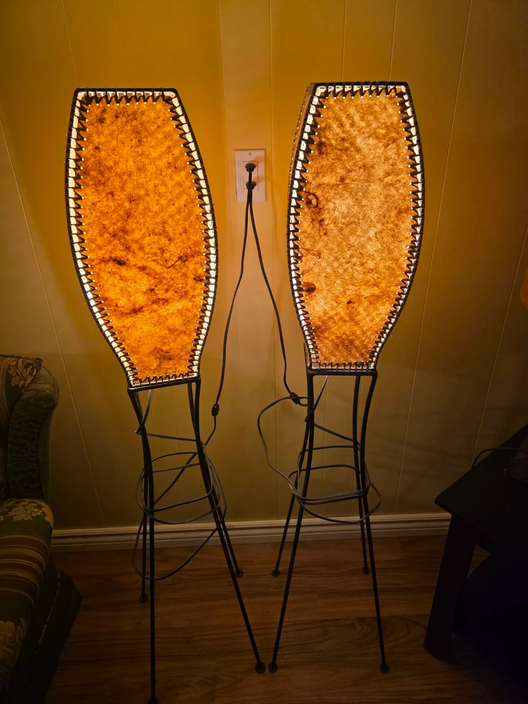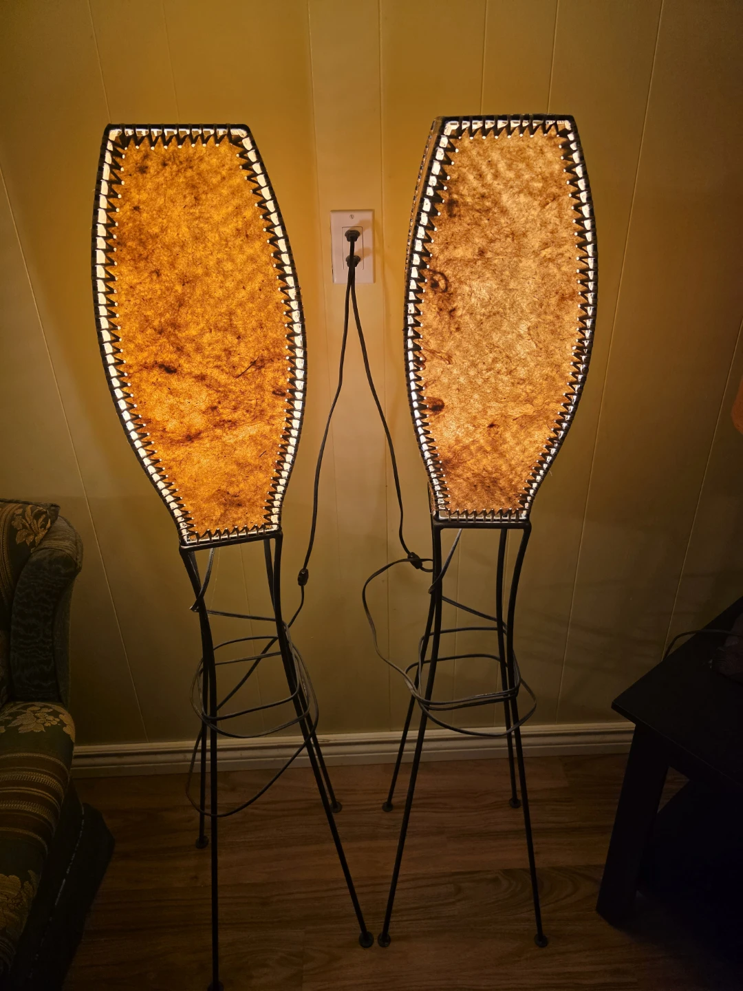 Selling a unique pair of vintage floor lamps! They feature a woven design with a black metal base. These lamps would add a cool, retro vibe to any room