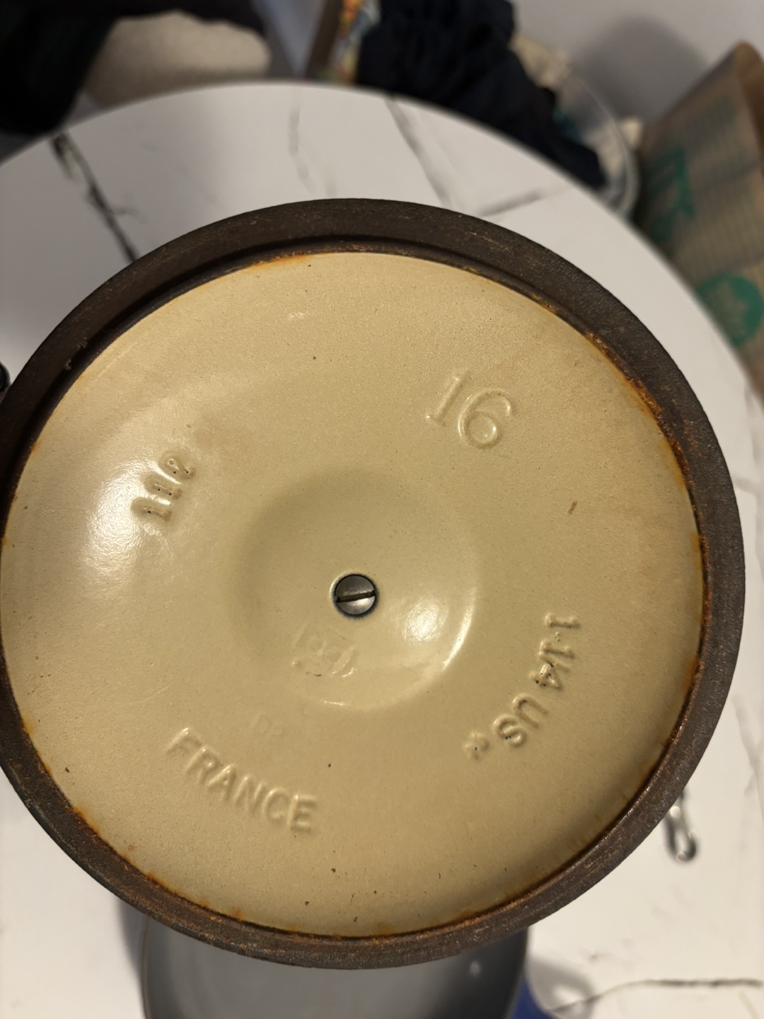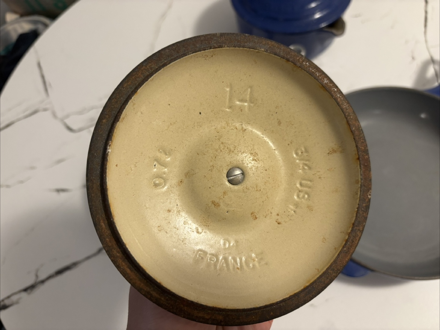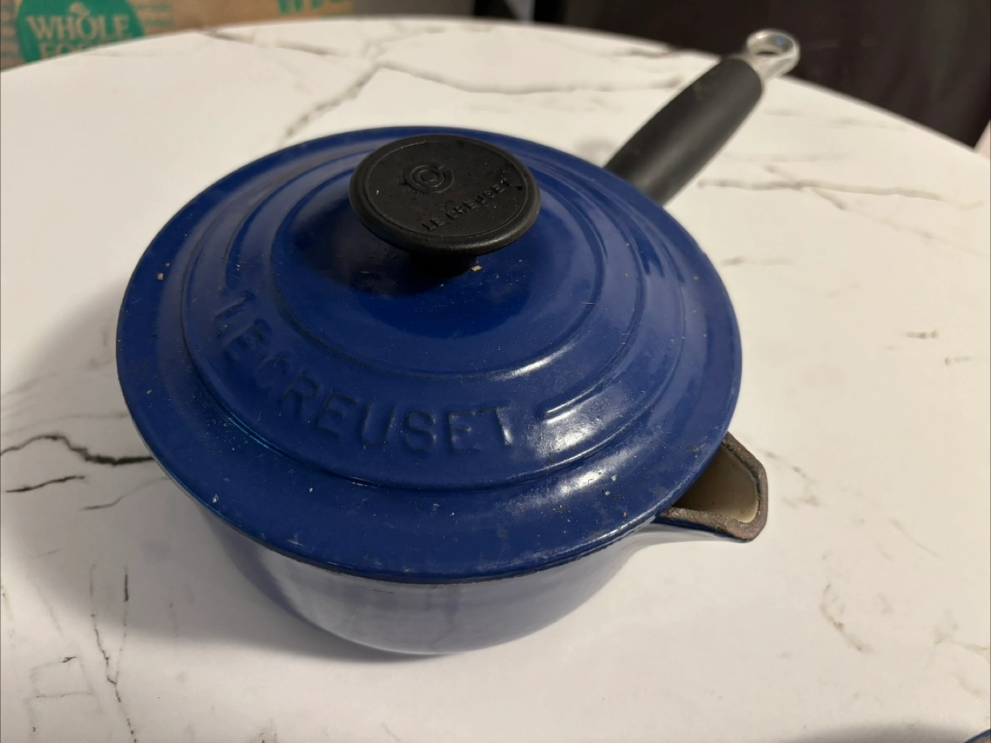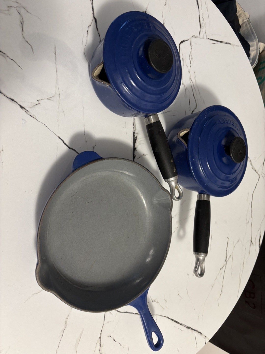 Selling a set of Le Creuset cookware! Includes a fry pan and two sauce pots, all in a lovely blue colour. The bottom of one pot says '23' and another says '16'. Great for any kitchen!