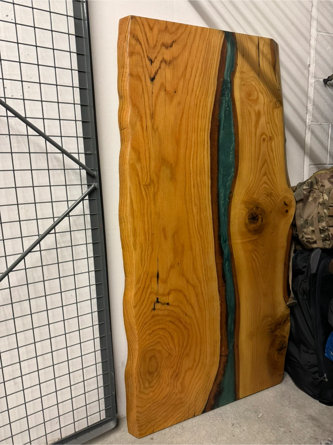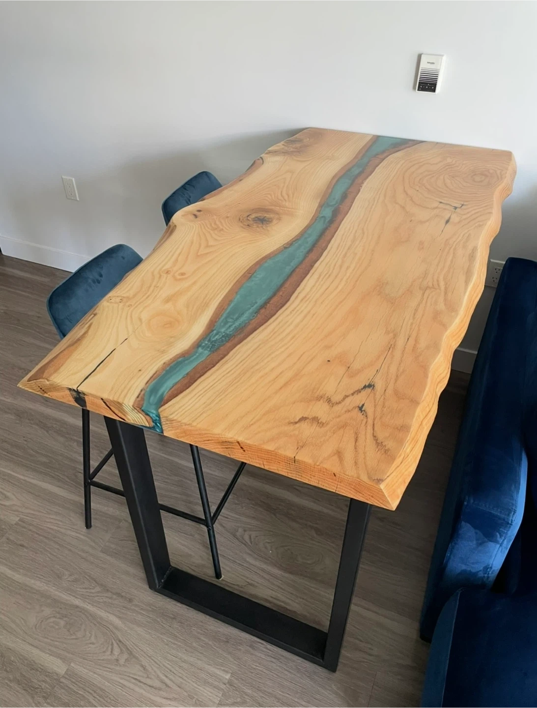 Selling a beautiful custom-made live edge wood tabletop 70x153cm with a stunning resin river running through the middle. The table features a unique, natural edge and a smooth, matte resin finish.