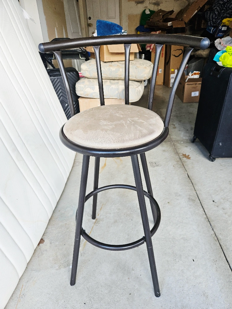 Selling a swivel bar stool. It features a backrest and a circular footrest for added comfort. The seat is upholstered in a neutral, light brown fabric, and the frame is a dark brown metal. Great for a kitchen island or home bar!