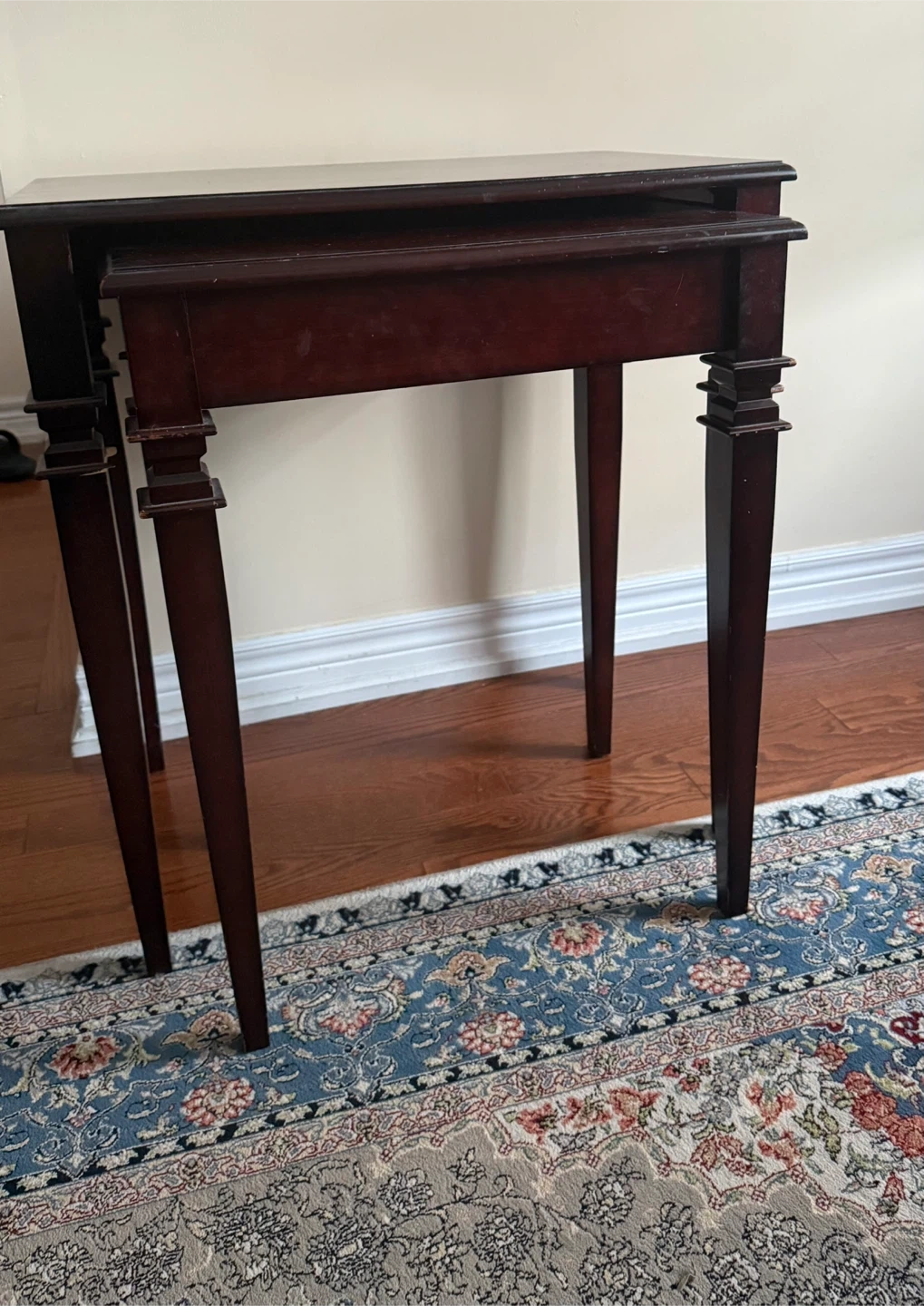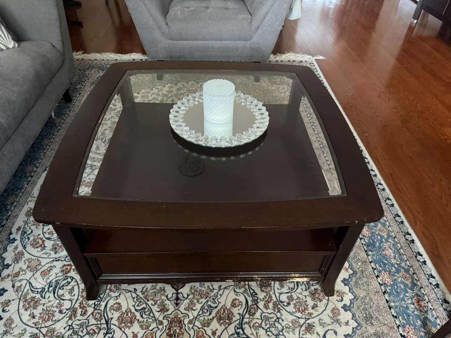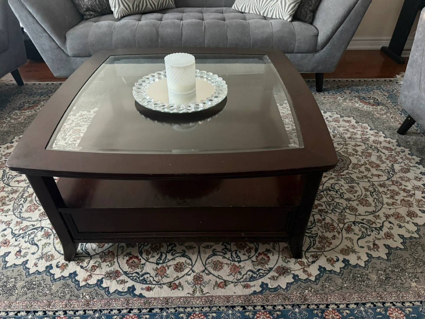 Two full sofas, coffeetable, sofatable, and area rug carpet