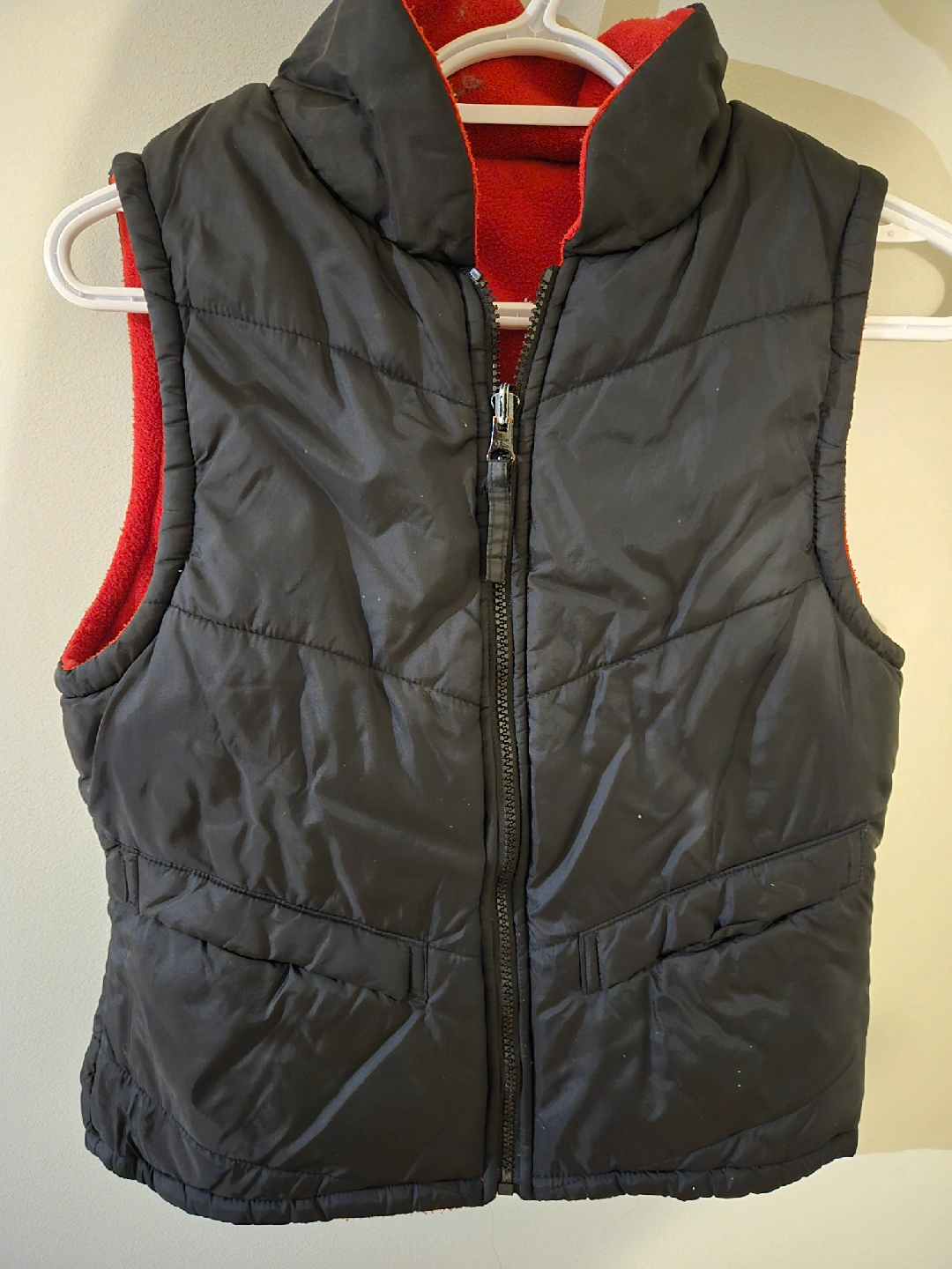 Selling a reversible vest! One side is a cozy red fleece, perfect for adding a pop of colour. The other side is a sleek black quilted material, great for a more understated look. It's in good condition and ready for a new home
