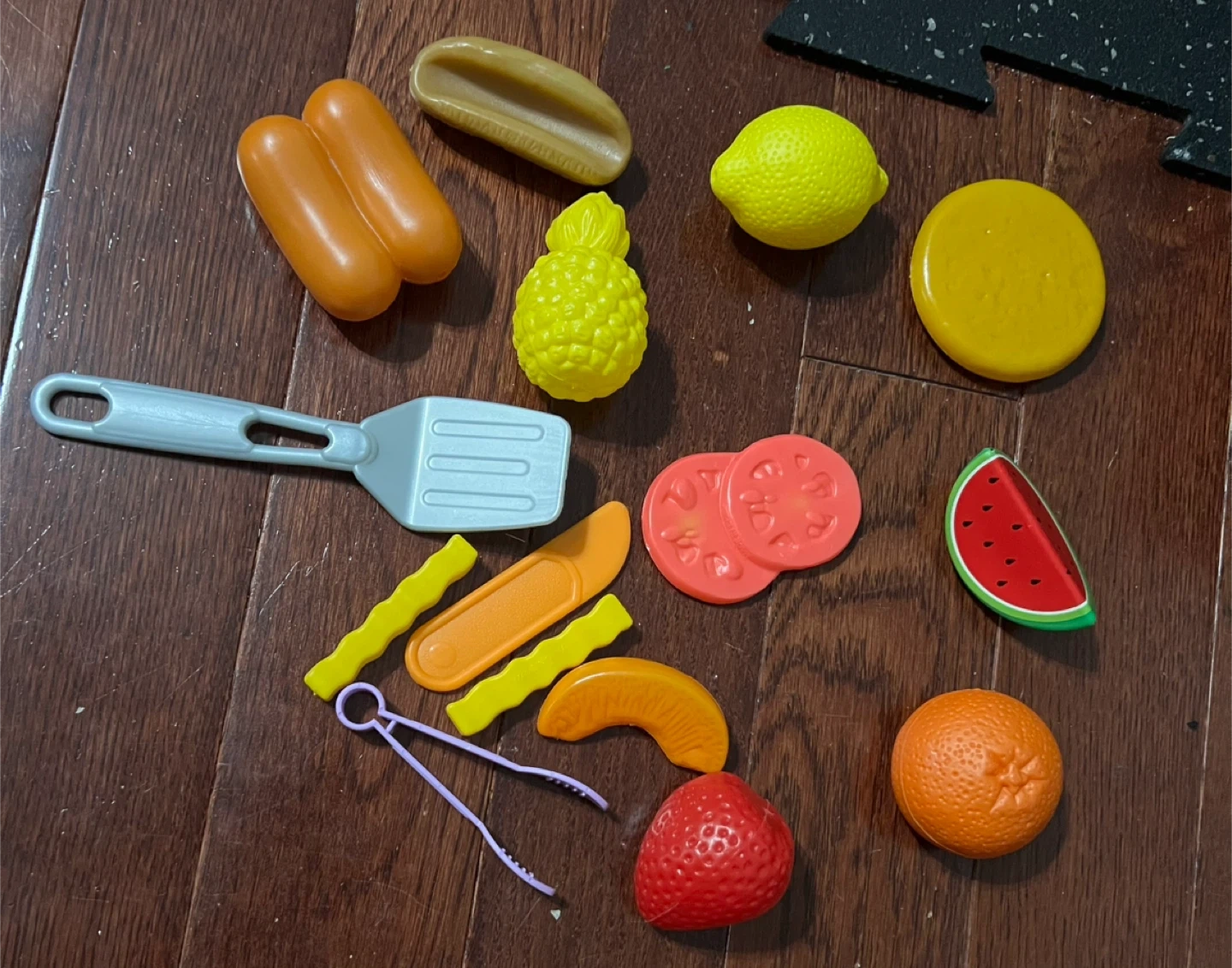 A fun collection of toy food items for pretend play! Includes fruits, veggies, and even a hot dog bun and fries.