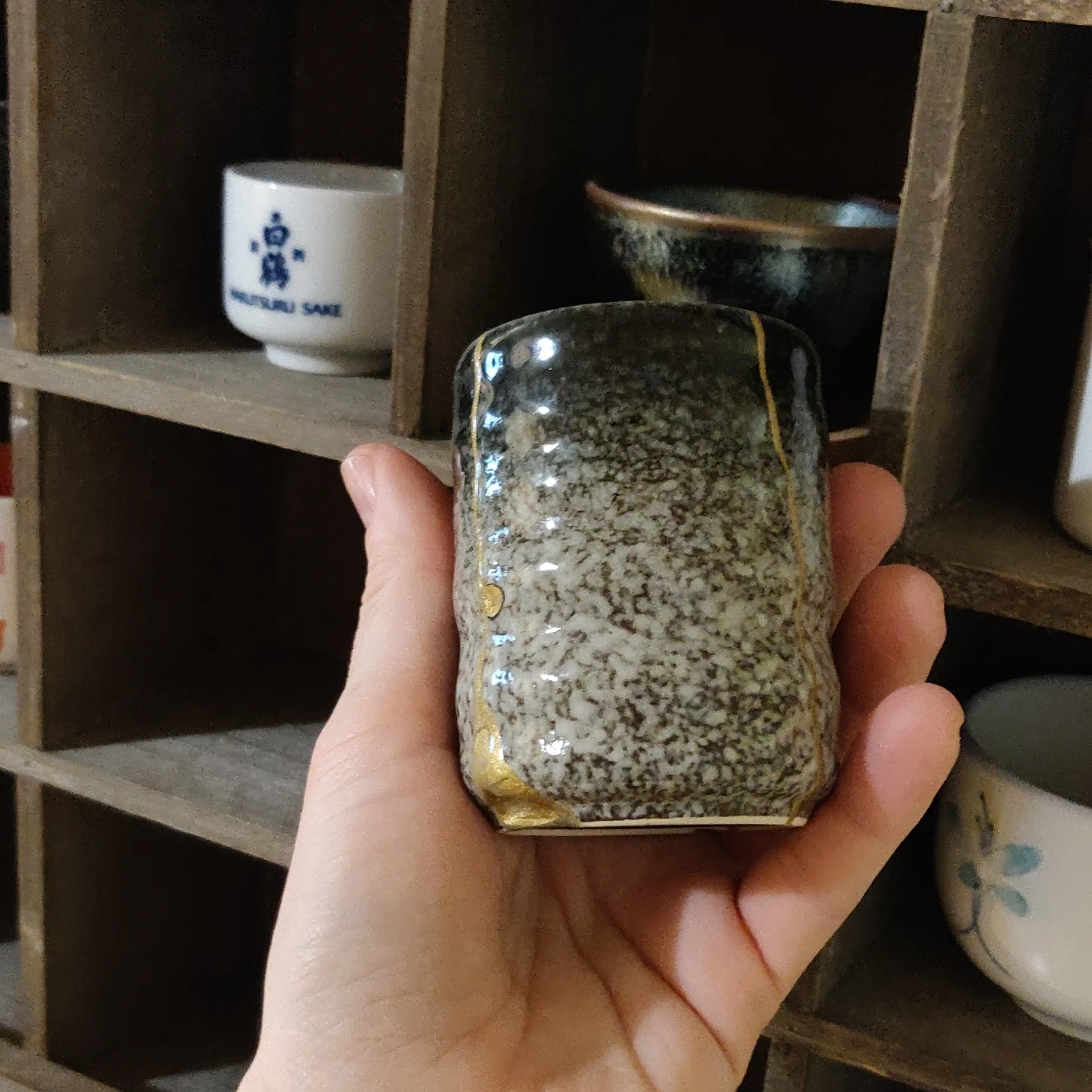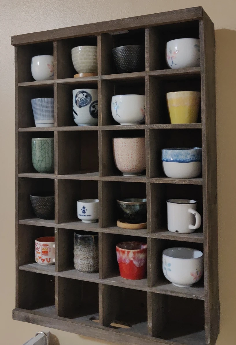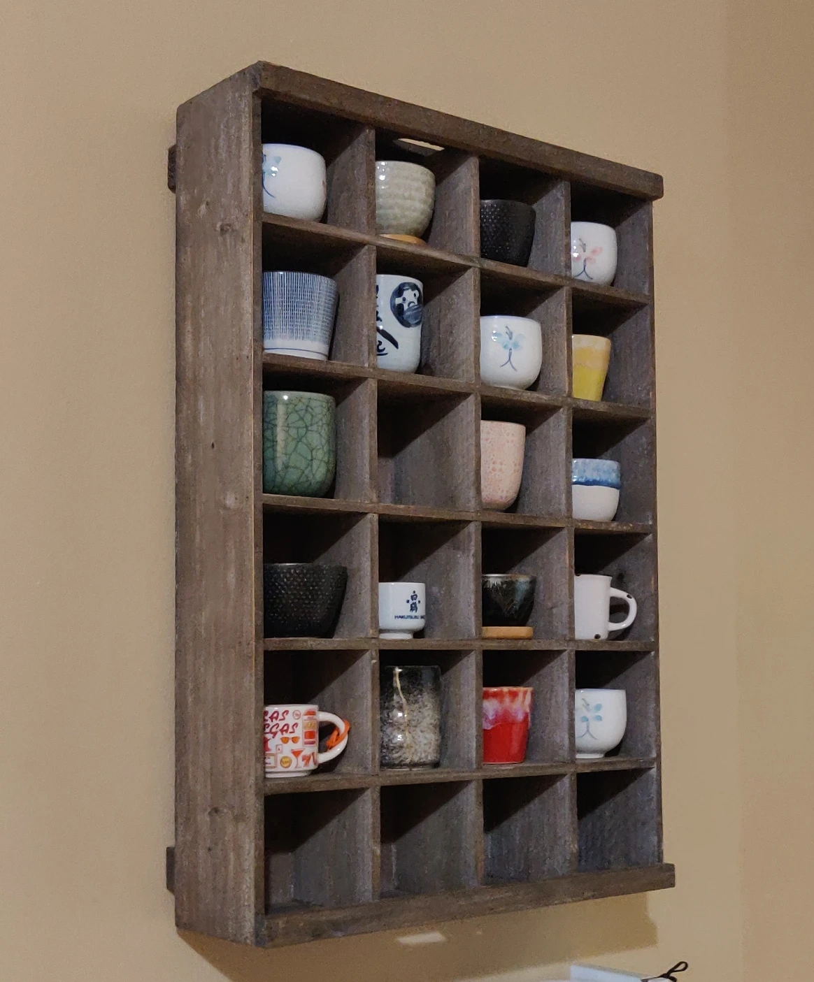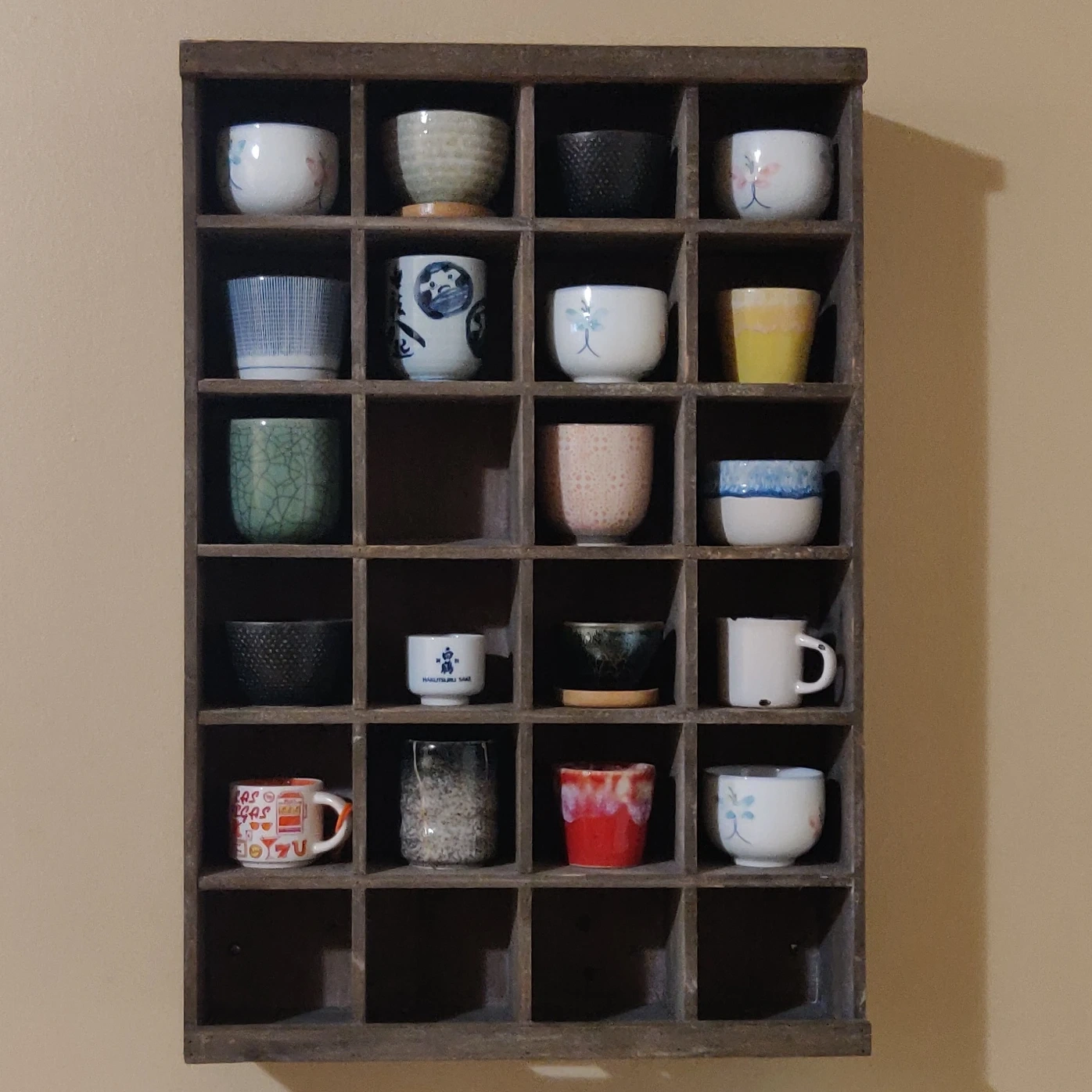 A beautiful display of assorted tea, espresso, and sake cups in a wooden crate. Square cubbies measure about 9cm square. whole display measures about 40cm wide, 59cm high, 10cm deep. 19 cups, 18 are in great condition, one broke and was glued with non-toxic adhesive with food grade gold in it (Kintsugi) and is safe to use with hot drinks.