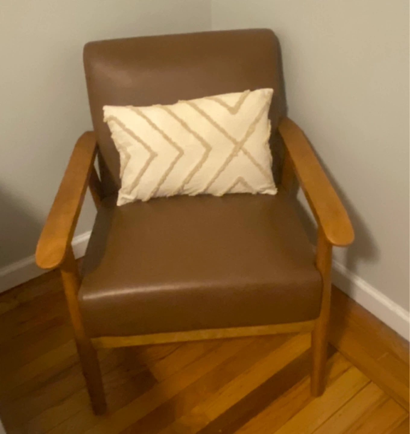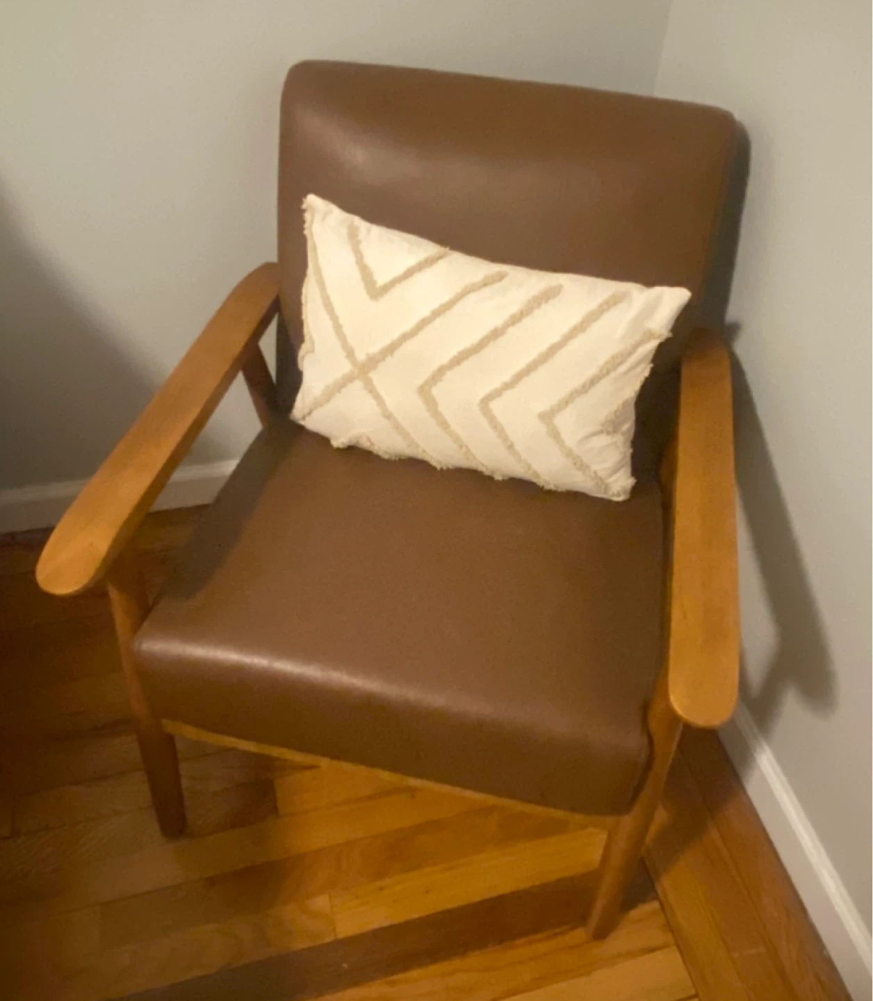 Comfortable and stylish faux leather armchair in good condition and would be a great addition to any living room or bedroom. With or without pillow.