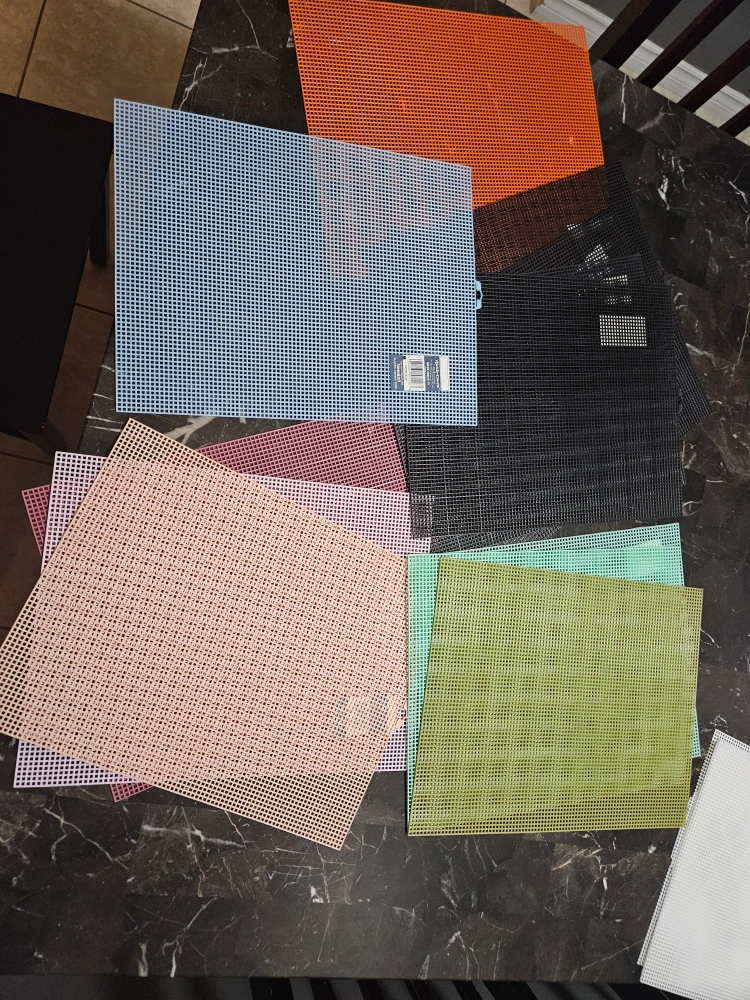 I'm selling a set of plastic canvas sheets in various colours, and two white.Perfect for all sorts of crafts and projects. Never used. Seven count. $10 for all.