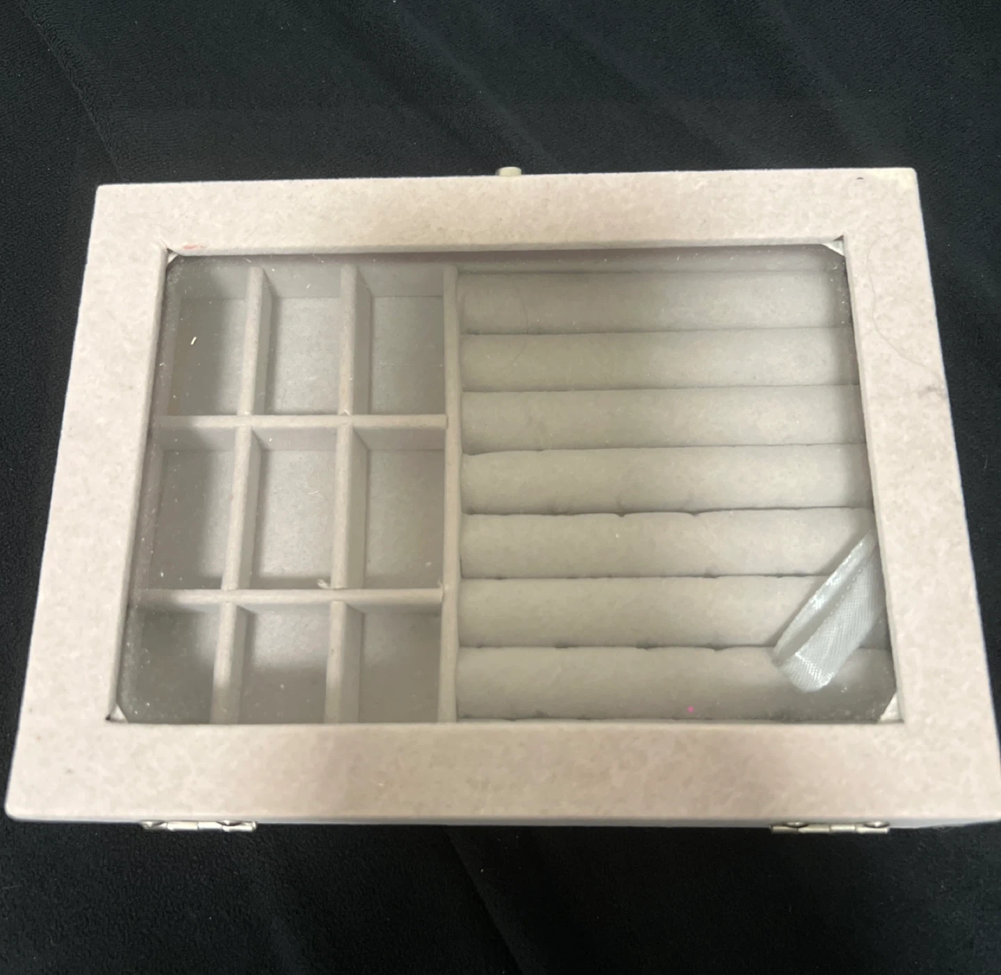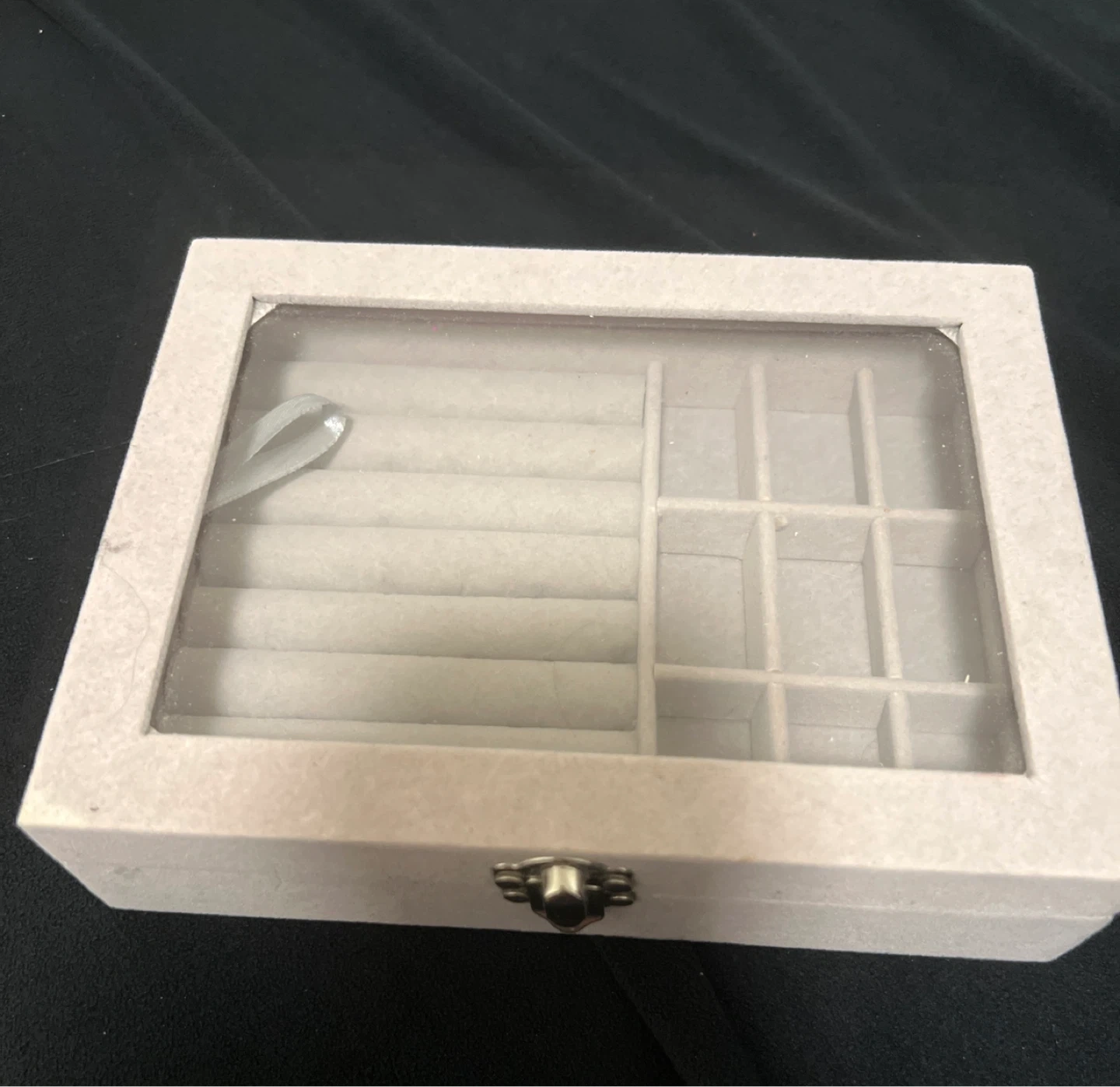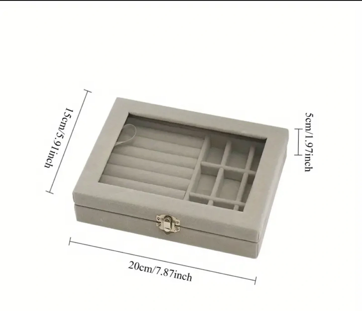 Selling a grey velvet jewelry box! It's perfect for keeping your rings, necklaces, and other small treasures organized and safe. The box has a clear lid so you can easily see what's inside. Dimensions are approximately 20cm x 15cm x 5cm