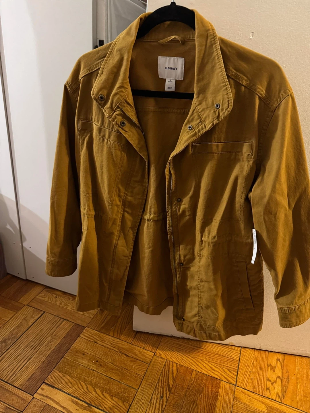 This is an Old Navy jacket in petite size small that fits for medium as well. It's a stylish piece perfect for layering or wearing on its own. The colour is a nice neutral tone, mustard yellow, and it's brand new still tag on it in great condition!