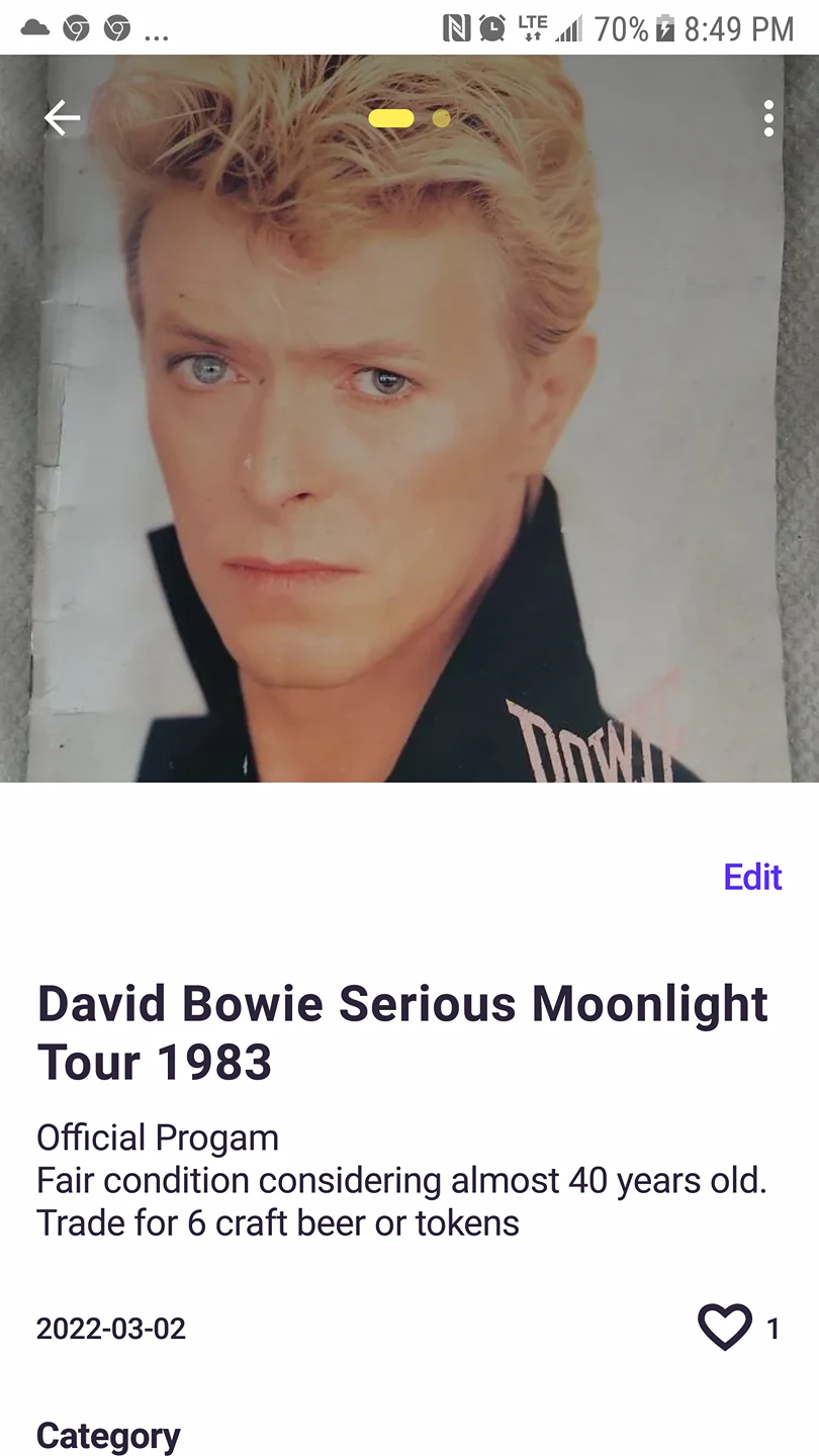 1 / 31 / 3Buy & SellDavid Bowie Serious Moonlight Tour 1983 ProgramDavid Bowie Serious Moonlight Tour 1983 Program$25Fair condition 40 year old programConditionOkayWHERE TO MEETWest Queen WestView MapSELLERBrian RWest Queen West1000+196 reviews0 chats·1 favorites·68 viewsSEND CHAT TO SELLERHi Brian R! I’m interested in your listing.Hi Brian R! I’m interested in your listing.Get the Karrot app to chatSign In to chat