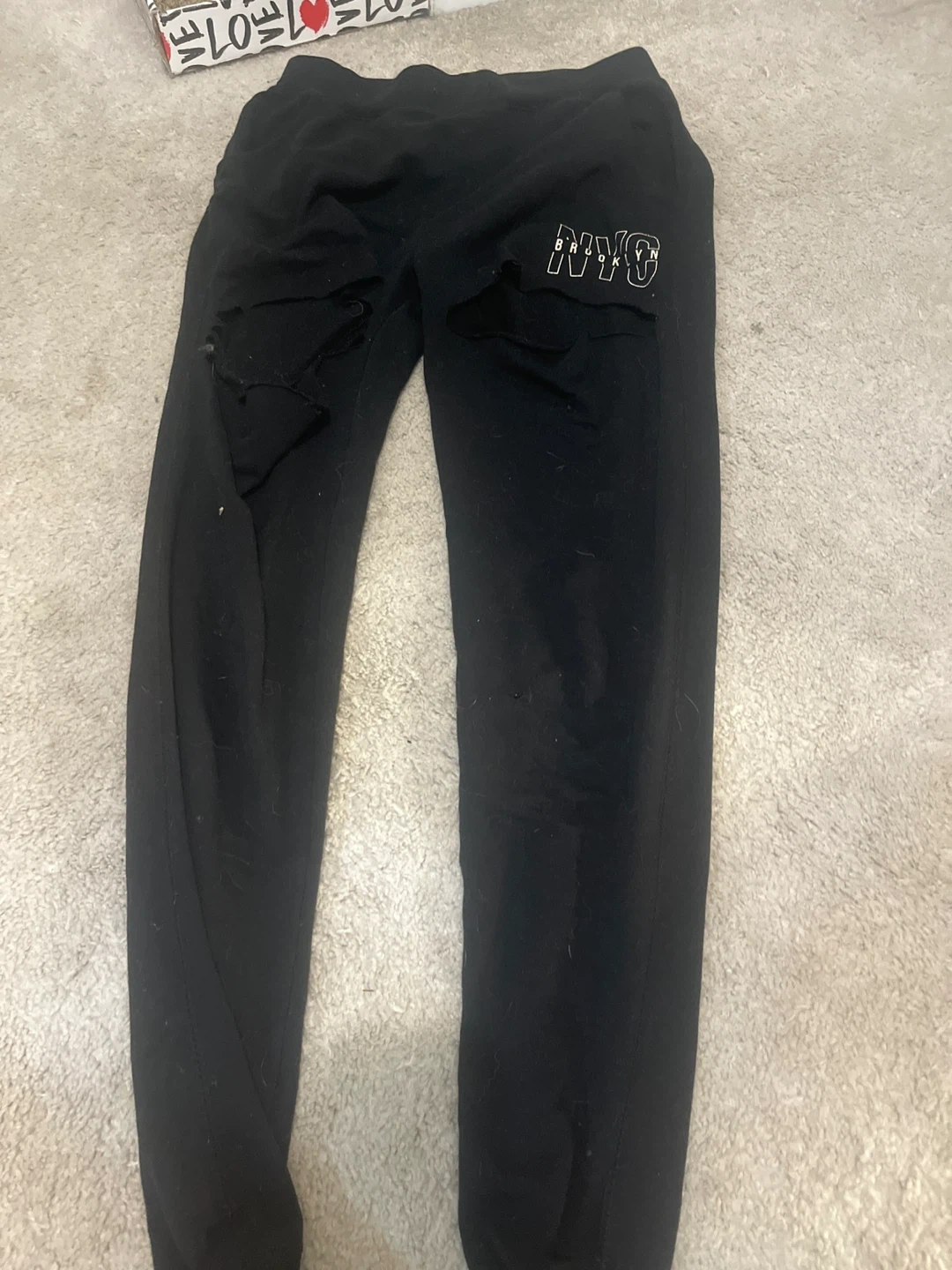 Selling a pair of black sweatpants with "NYC Brooklyn" on the leg. They have some rips and signs of wear, as shown in the photos. Still comfy for lounging around the house!
