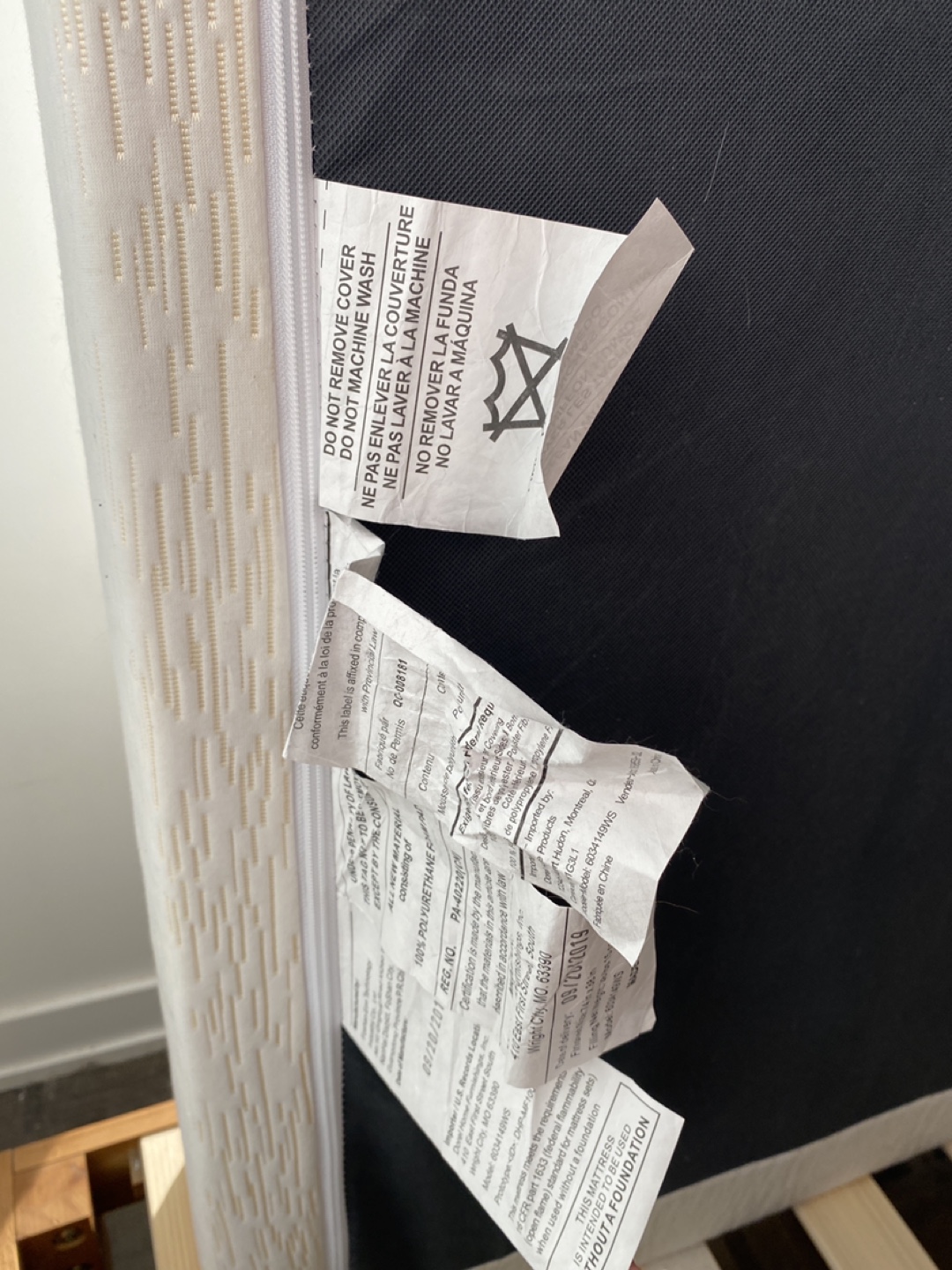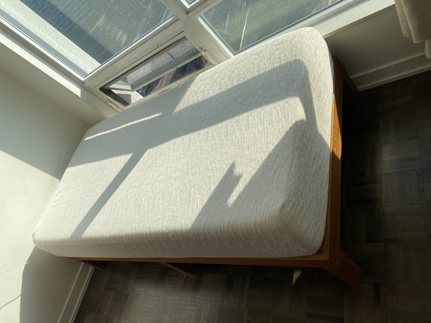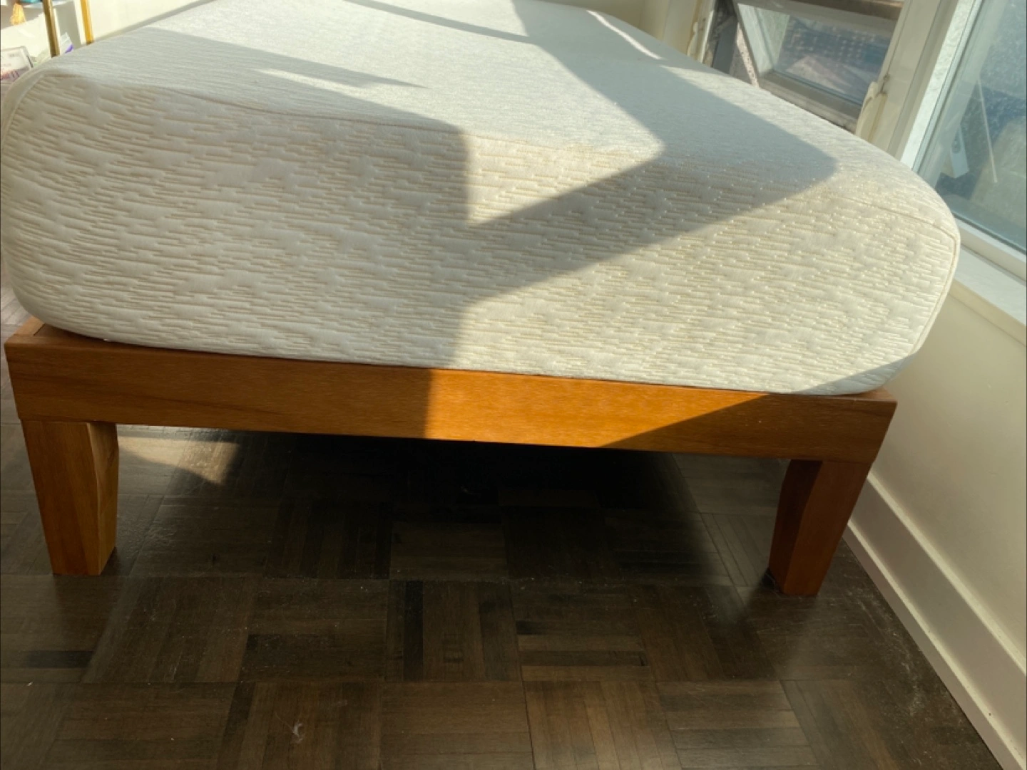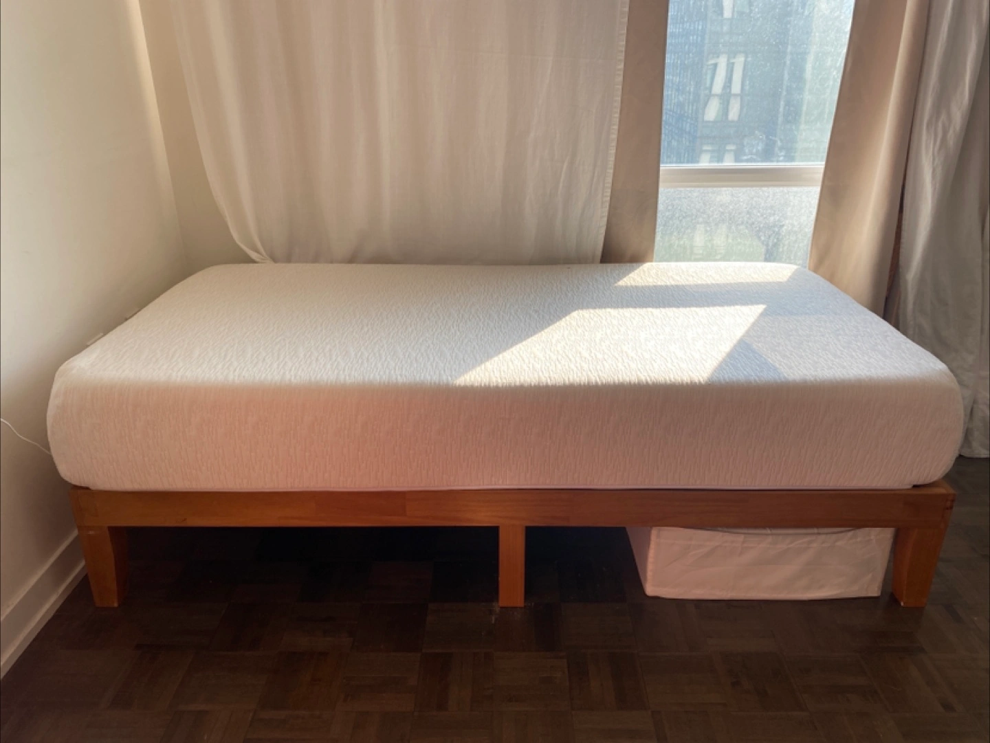 A twin-size solid wood bed frame and a 10" Medium Memory Foam Mattress both from Wayfair. It measures 74.5 inches in length and 38 inches in width. The height is 14 inches. From a clean bedbugs free home. Was always used with a mattress cover.