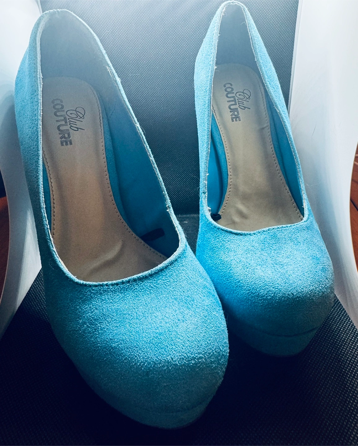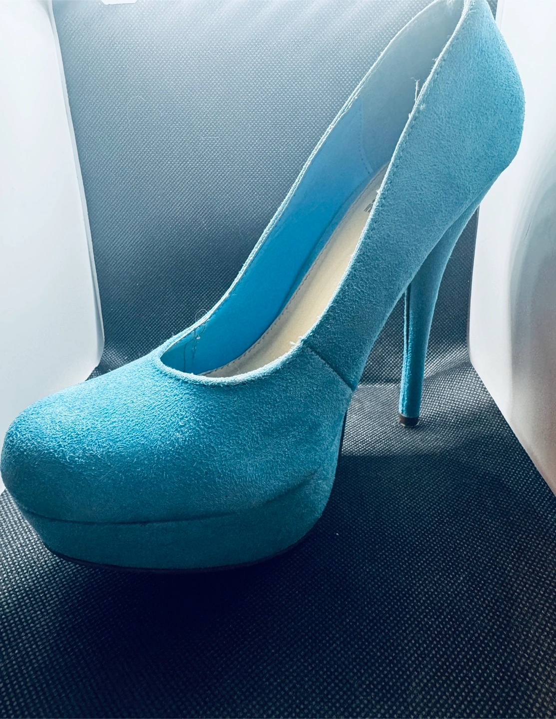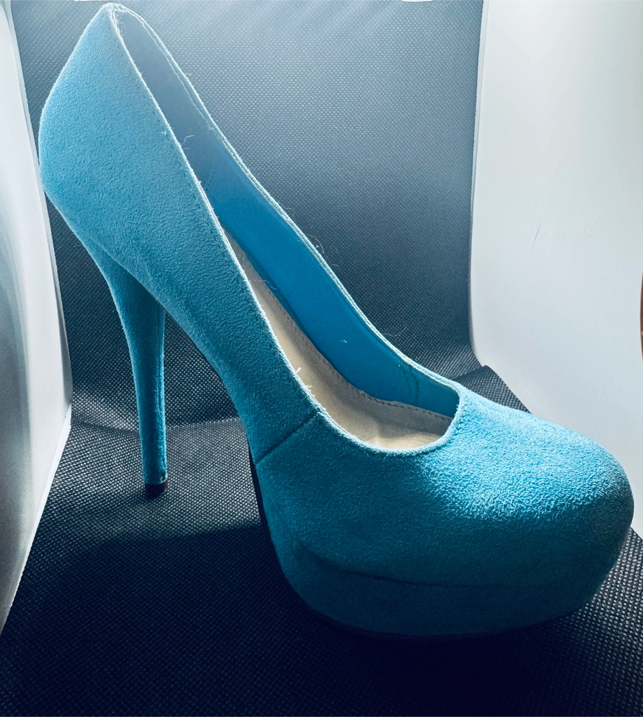 These stylish shoes feature a soft suede finish, a sleek high heel, and a comfortable, classic pump design. These are used and have a small amount of wear. Size 7 Specifications: * Brand: Club Couture * Type: High Heel Pumps * Material: suede * Colour: Blue * Heel Height: High * Style: Classic Pump