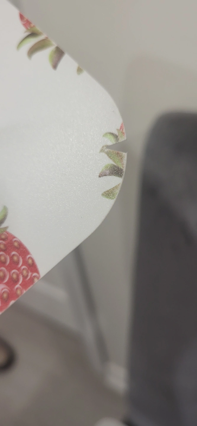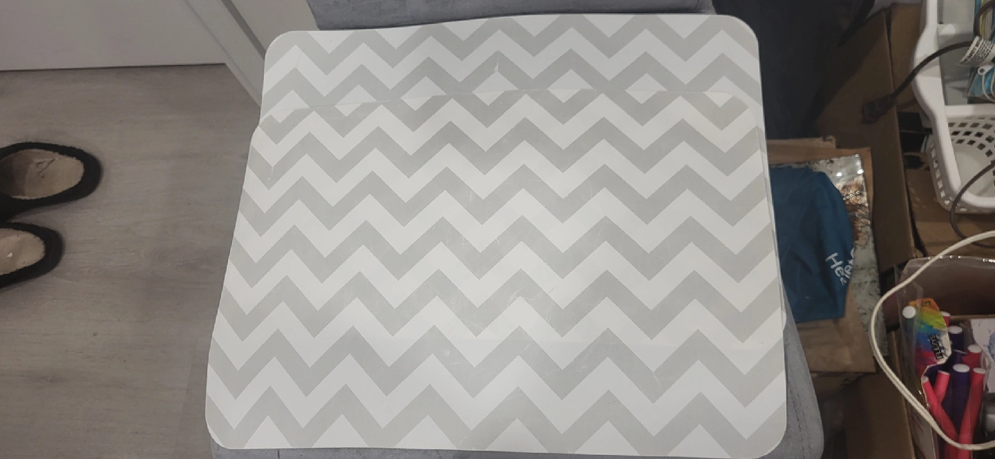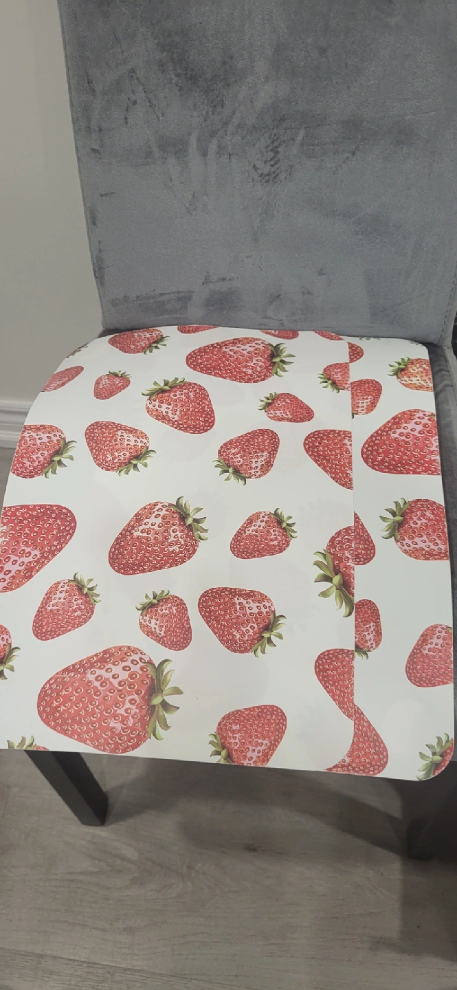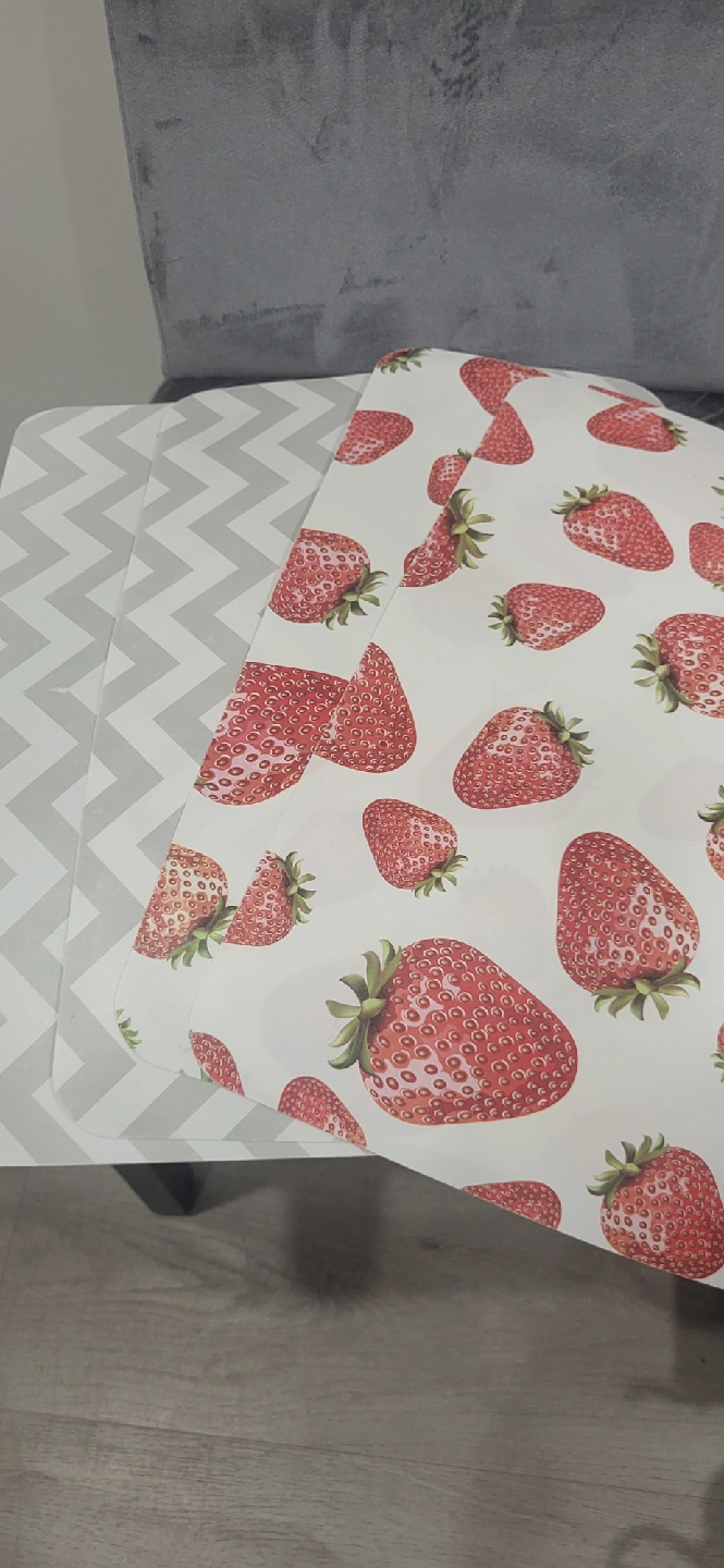 4 table mats. Two havs a strawberry pattern. Two have gray wavy lines. One mat has a tiny cut (shown in picture) $3.00 /4. Paid $1.25 each at Dollarama.