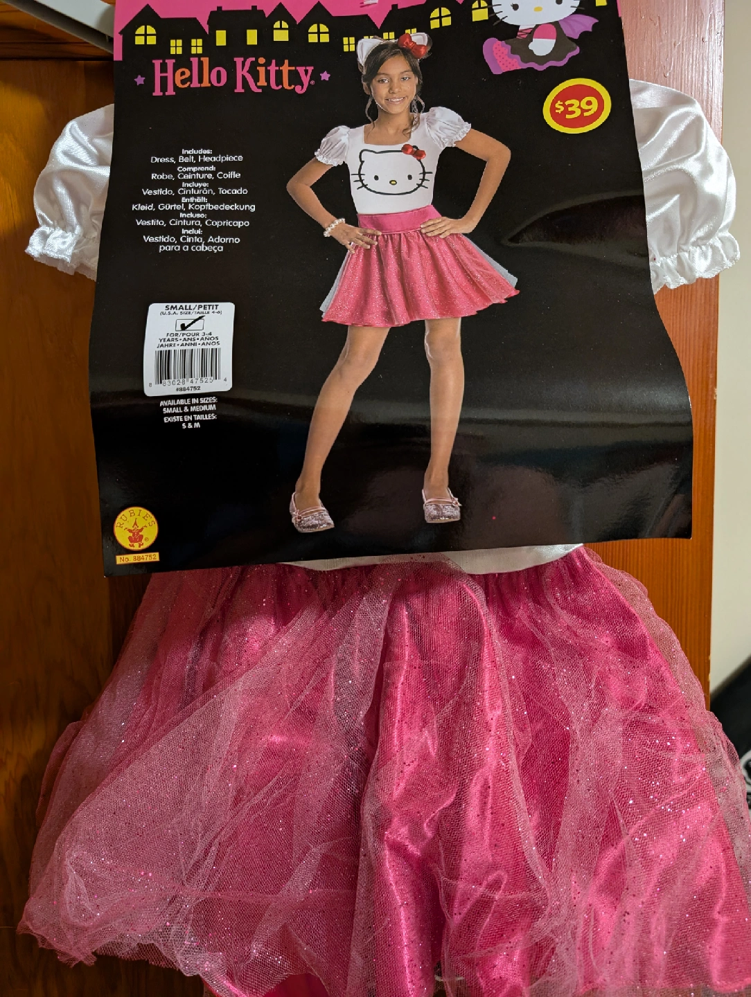 Selling a super cute Hello Kitty costume! It includes the dress, belt, and headpiece. Size is small. The original price was $39 sizes available small medium and large kids