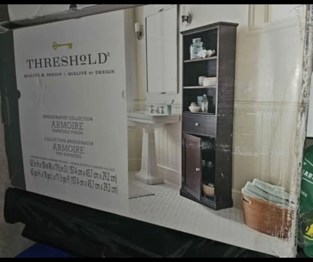 Selling a brand new, Threshold Bridgewater Collection Armoire with an espresso finish! The dimensions are 62 inches in height, 18 inches in width, and 11 1/2 inches in depth. It's in great condition and ready for a new home