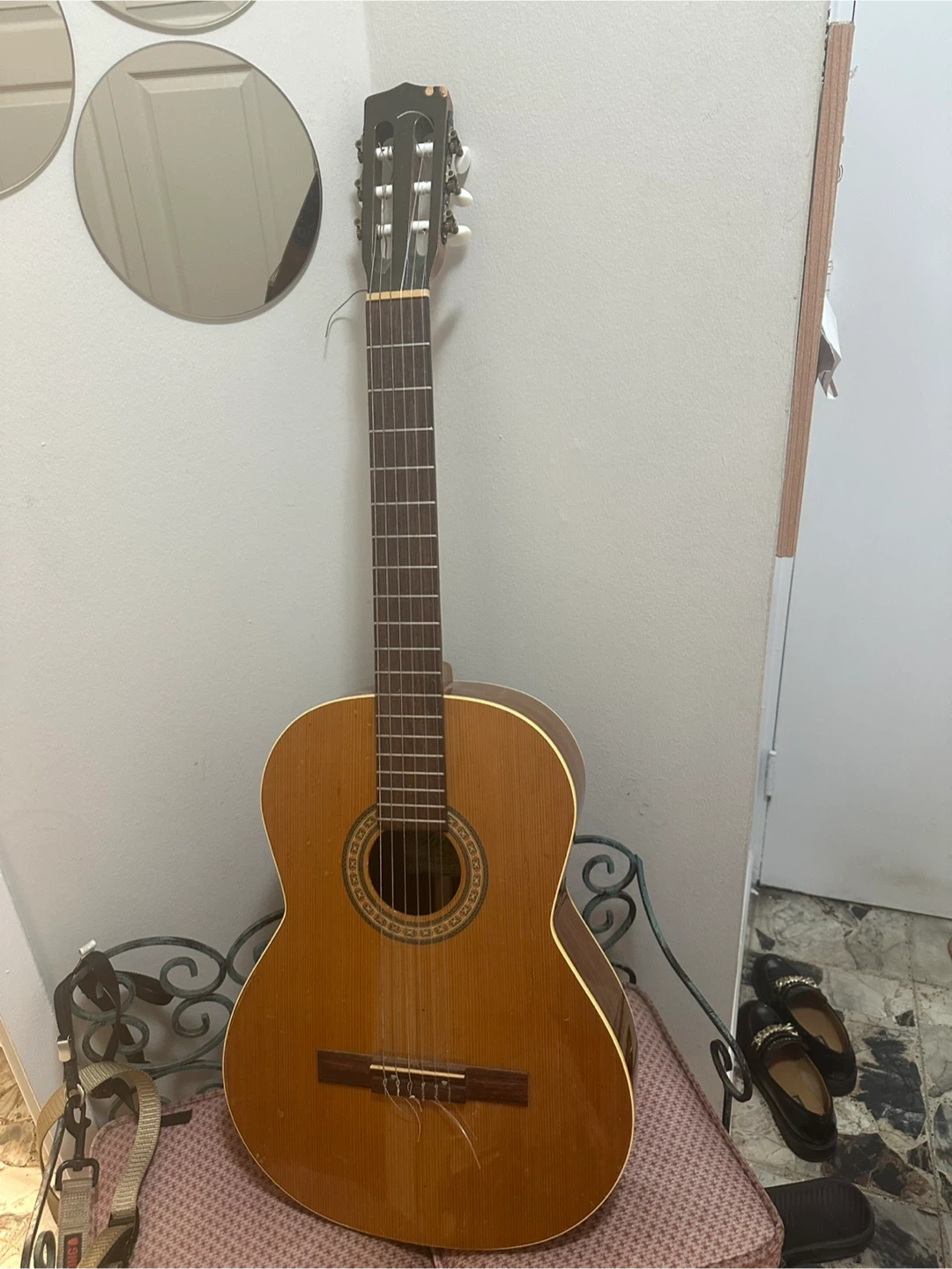 Selling an acoustic guitar. It's in used condition, with some wear and tear, but still plays well. Great for beginners or someone looking for a practice guitar!