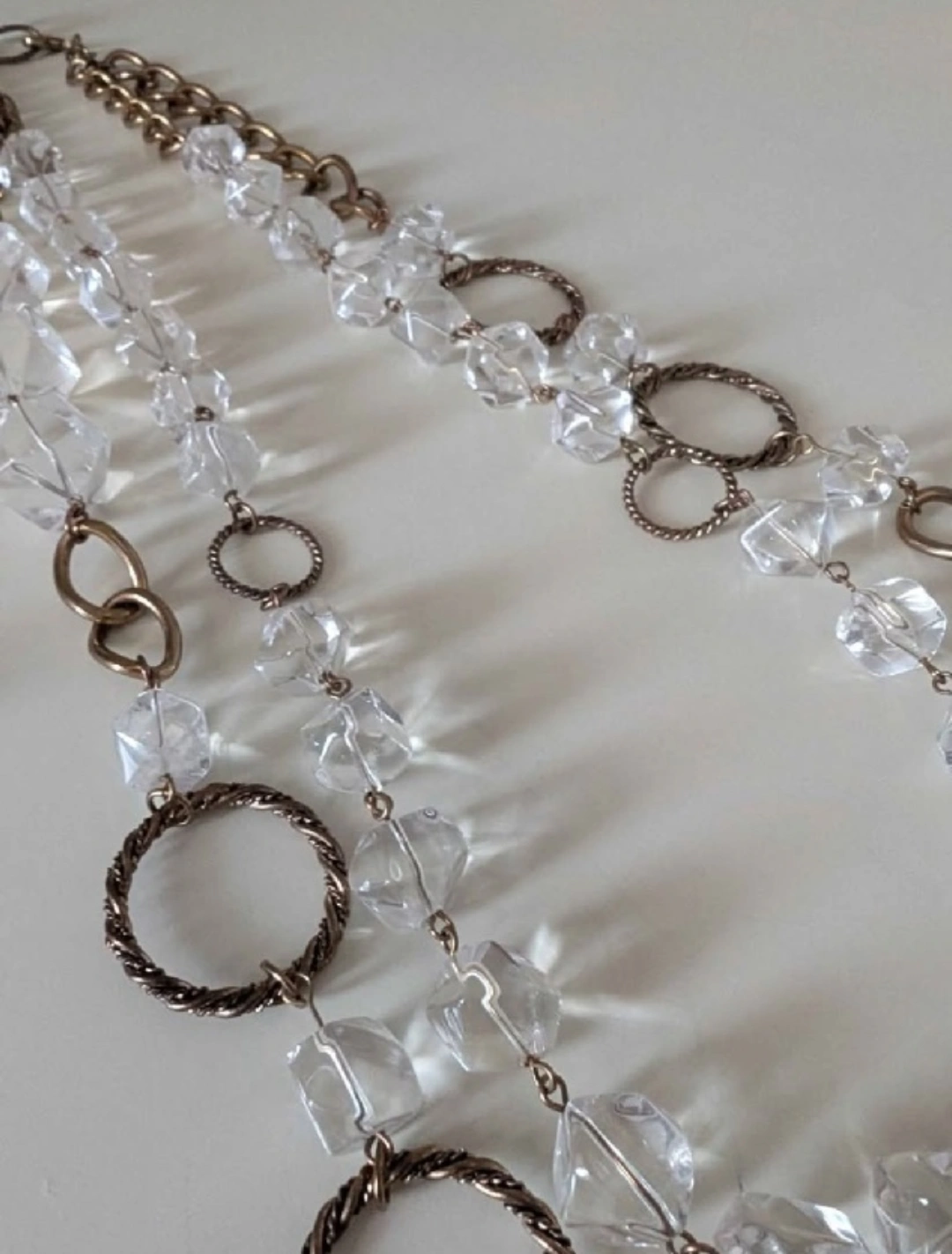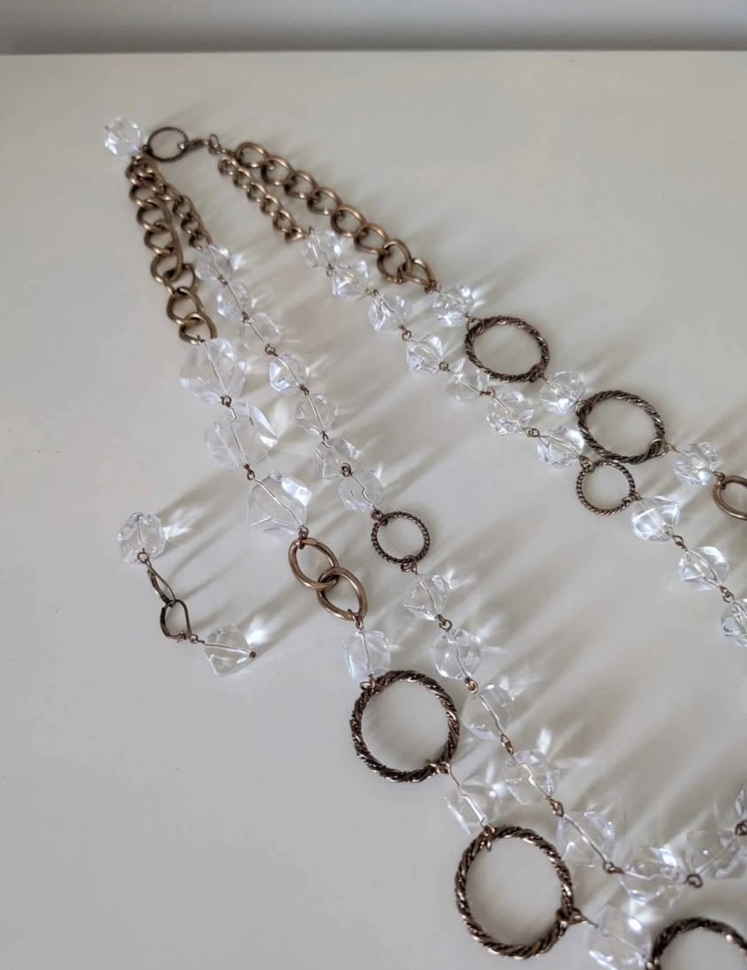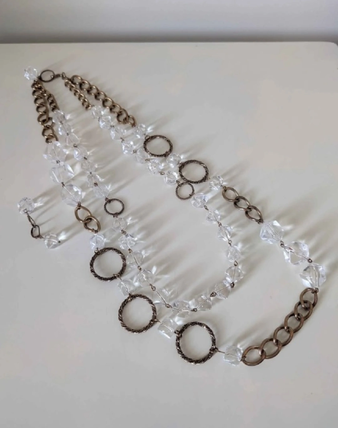 Selling a long necklace featuring clear crystal-like beads and bronze-tone metal chains and rings. It's in great condition and would make a stylish addition to any outfit! Vintage wear!