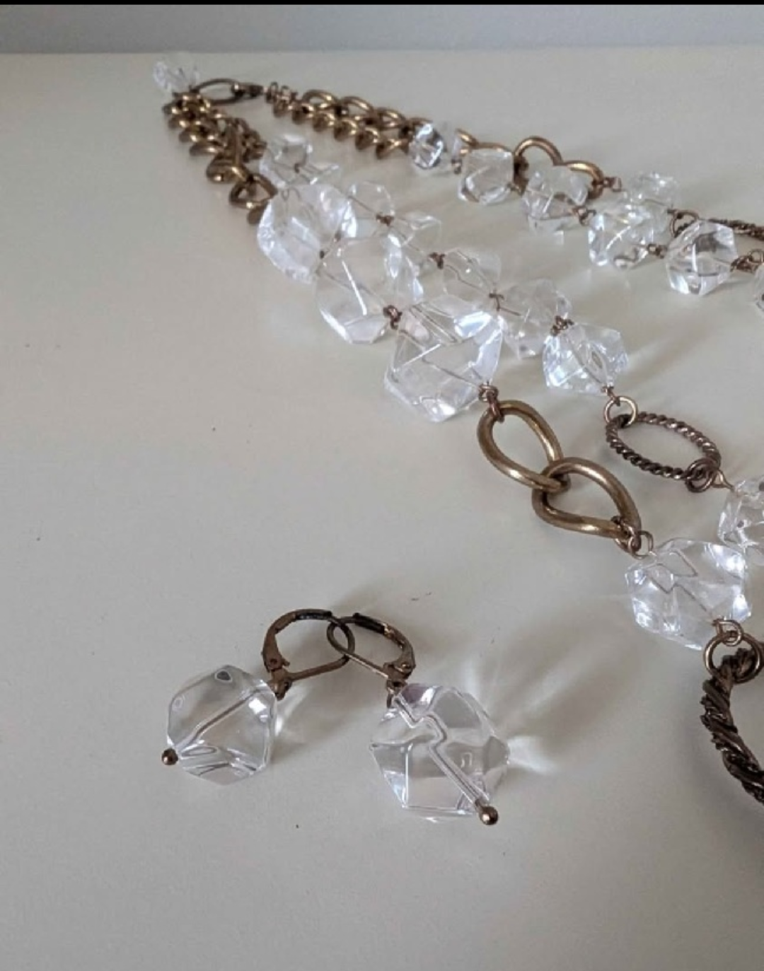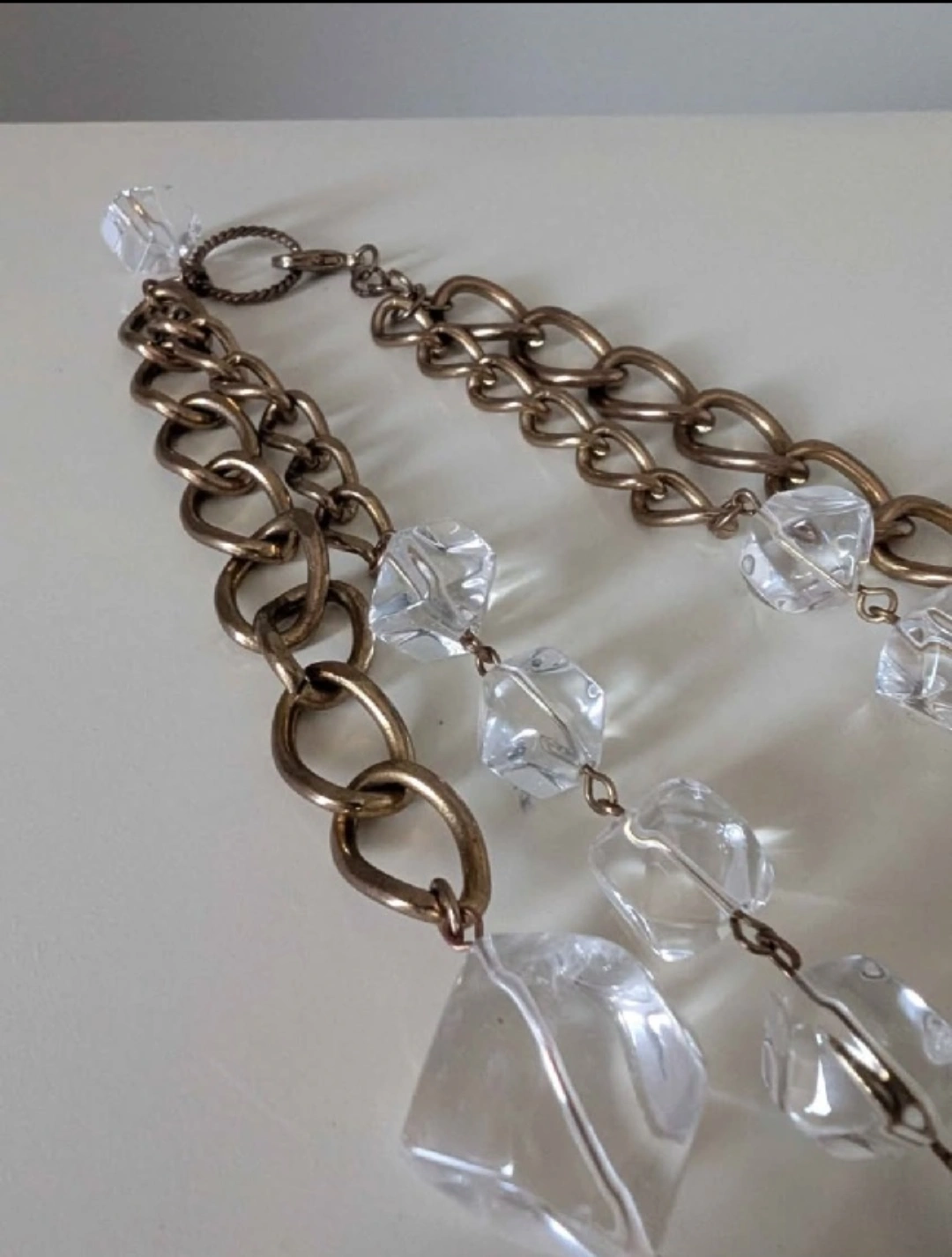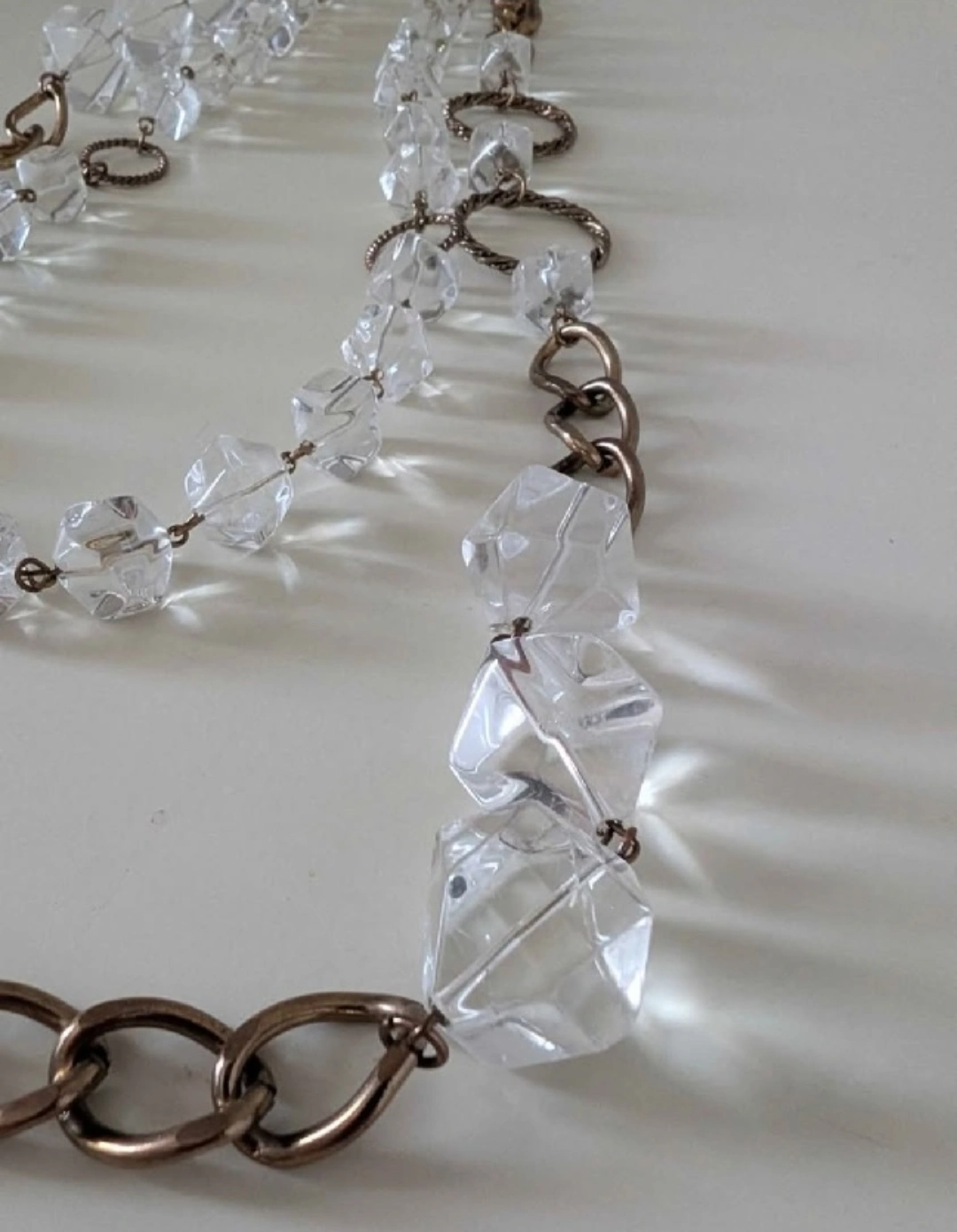 Selling a long necklace featuring clear crystal-like beads and bronze-tone metal chains and rings. It's in great condition and would make a stylish addition to any outfit! Vintage wear!