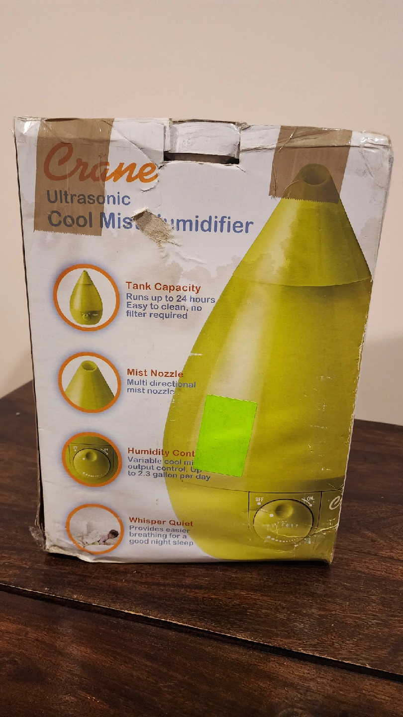 Selling a green Crane Ultrasonic Cool Mist Humidifier. It features a multi-directional mist nozzle and variable mist output control. The humidifier is whisper quiet, providing easier breathing for a good night's sleep. Tank capacity runs up to 24 hours and is easy to clean, no filter required. Box is included