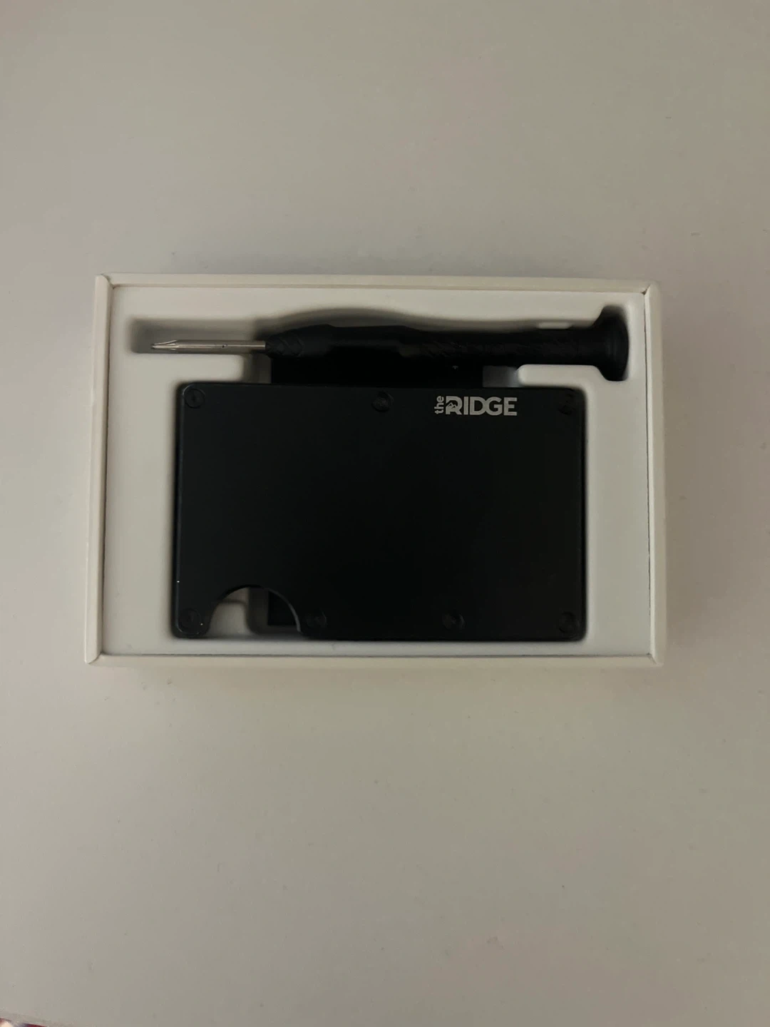 Selling a Ridge Wallet in black. It comes with box, screwdriver, and additional screws. It's in great condition and ready for a new owner!