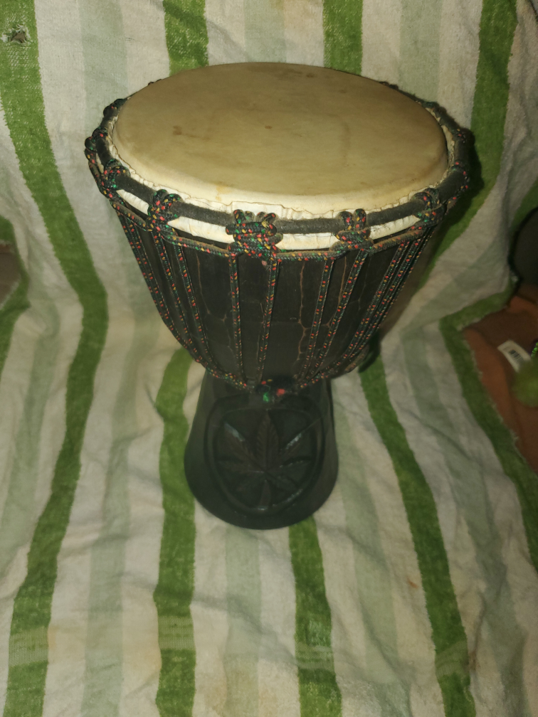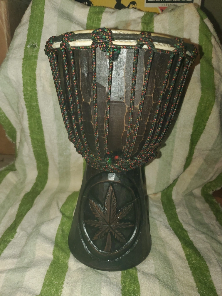 Selling a hand-carved djembe (bongo) drum. It features a unique pot leaf design and is in good condition. Perfect for anyone interested in percussion instruments!