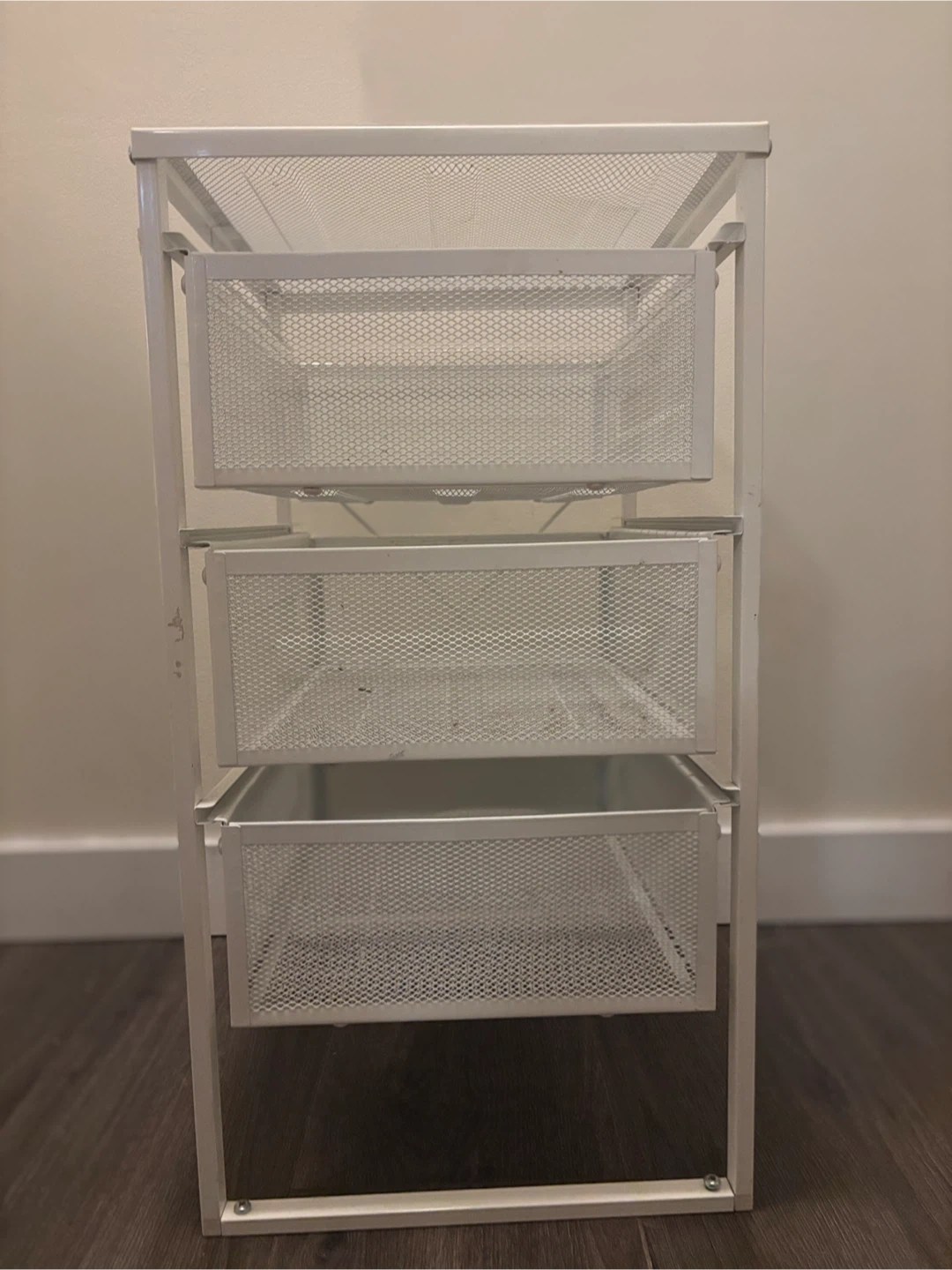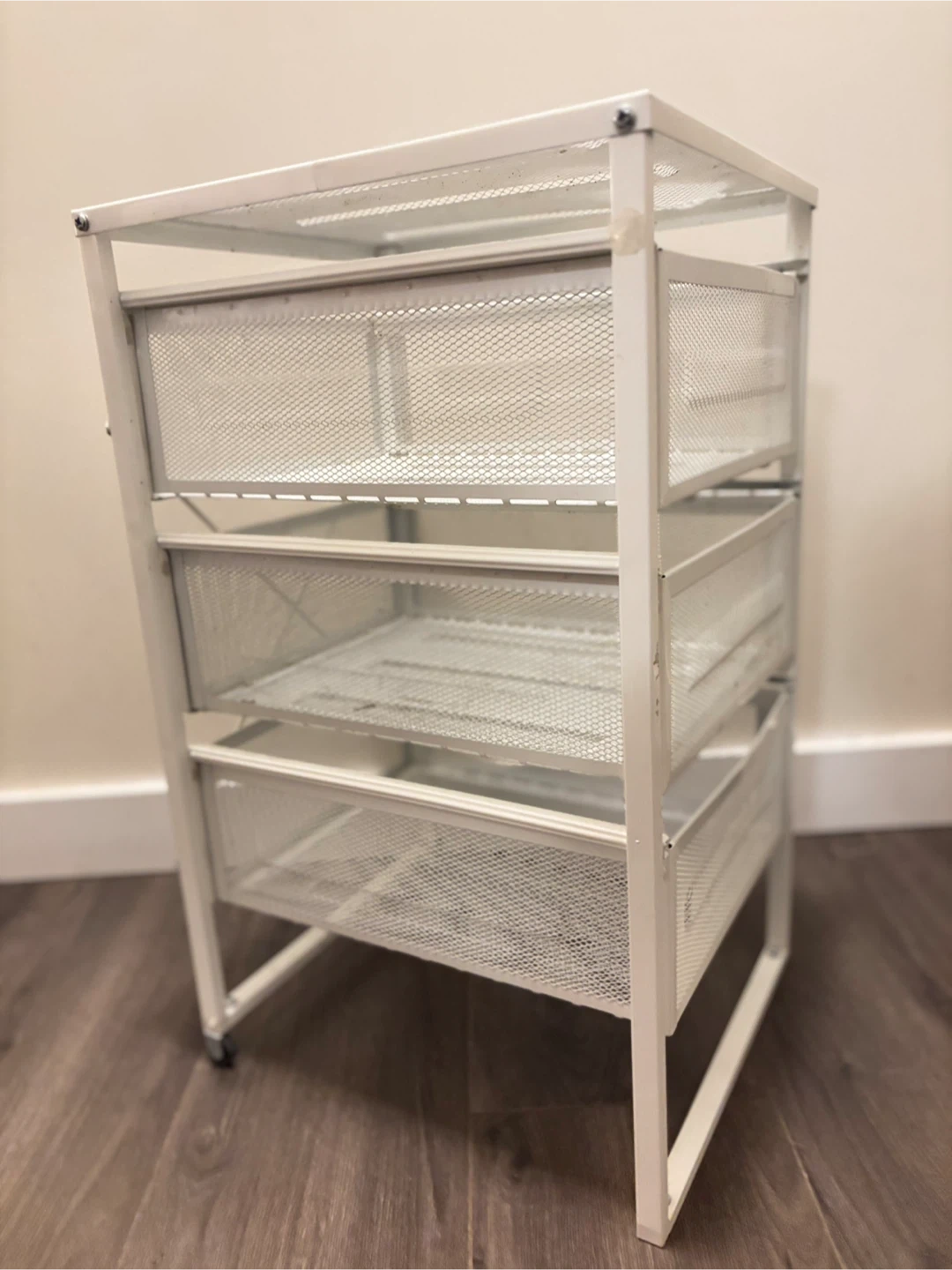 It is a utility cart. It's perfect for organizing anything, from craft supplies to kitchen essentials. The cart is white and made of metal, with three mesh drawers. It's in great condition and ready to roll into your home.