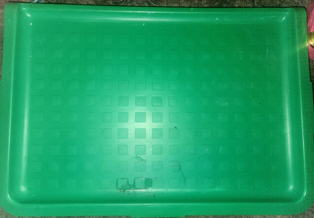 Selling a green plastic tray. It has a grid pattern on the surface. Perfect for organizing items or serving snacks! But I believe it is mainly used for storing your shoes on. Pick up only.