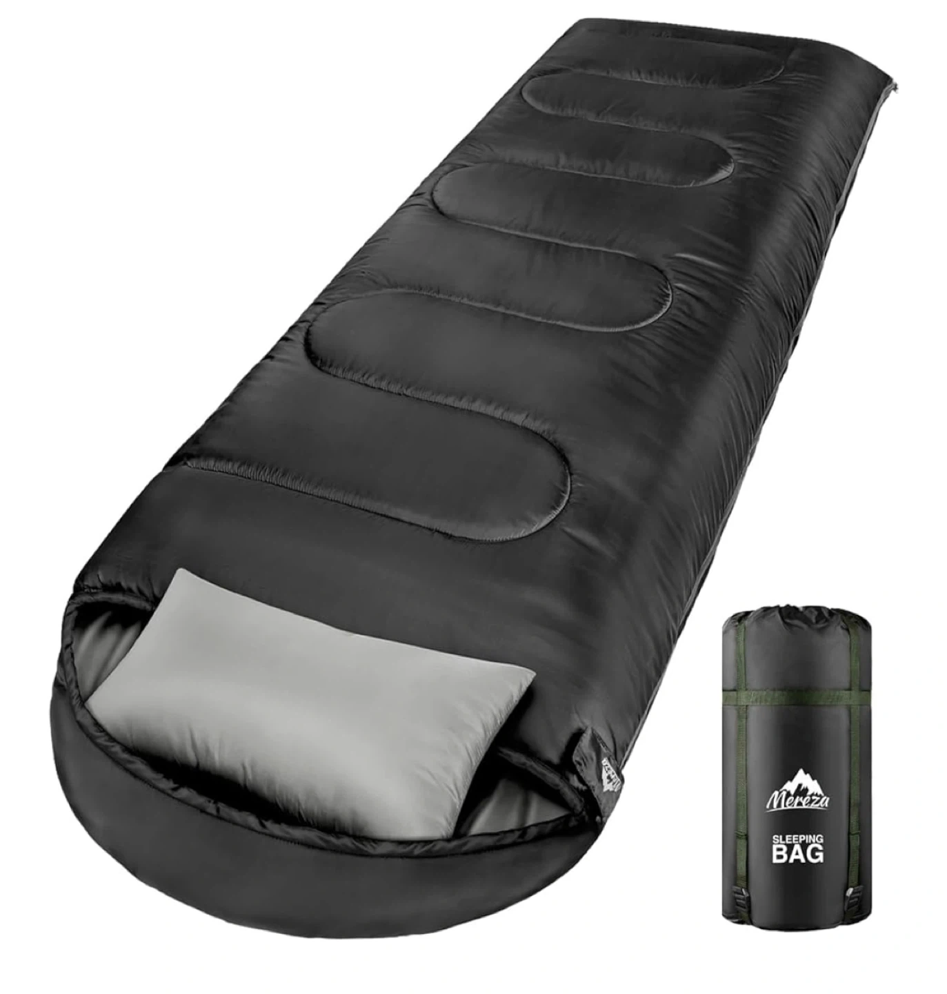 177This Meriza sleeping bag is perfect for camping! It comfortably fits campers up to 7 feet and is 15% bigger than standard sleeping bags. It's rated for comfort at 30°F, limit at 20°F, and extreme at 10°F. The dimensions are 96.6 inches/220cm in length and 33.5 inches/85cm in width. It weighs 2.5kg.