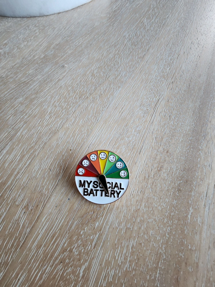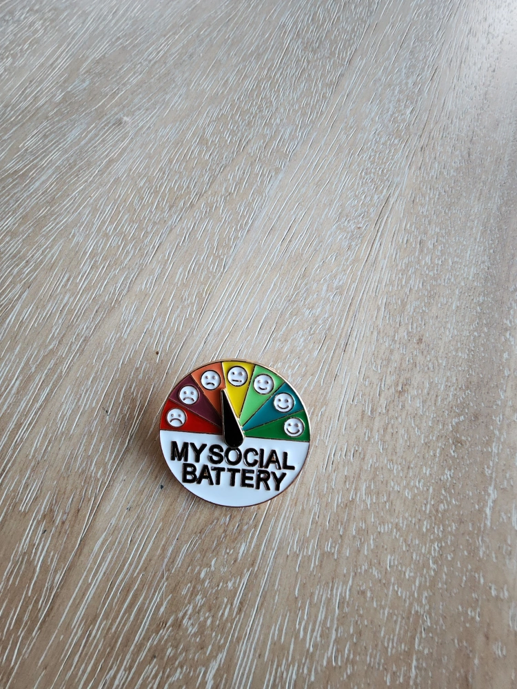 This is a fun enamel pin that shows your social battery level! It's a great conversation starter and a cute accessory to add to your bag or jacket *bin system
