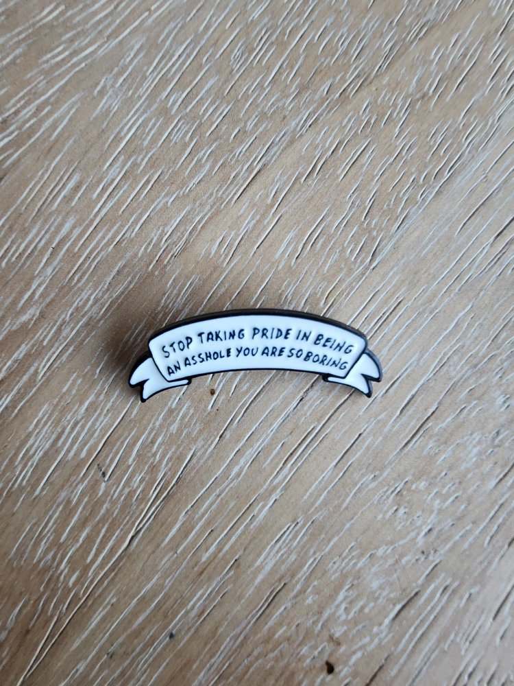Here's a fun enamel pin with the text "Stop taking pride in being an a**hole you are so boring" on it! It's in great condition and ready to be added to your collection or outfit