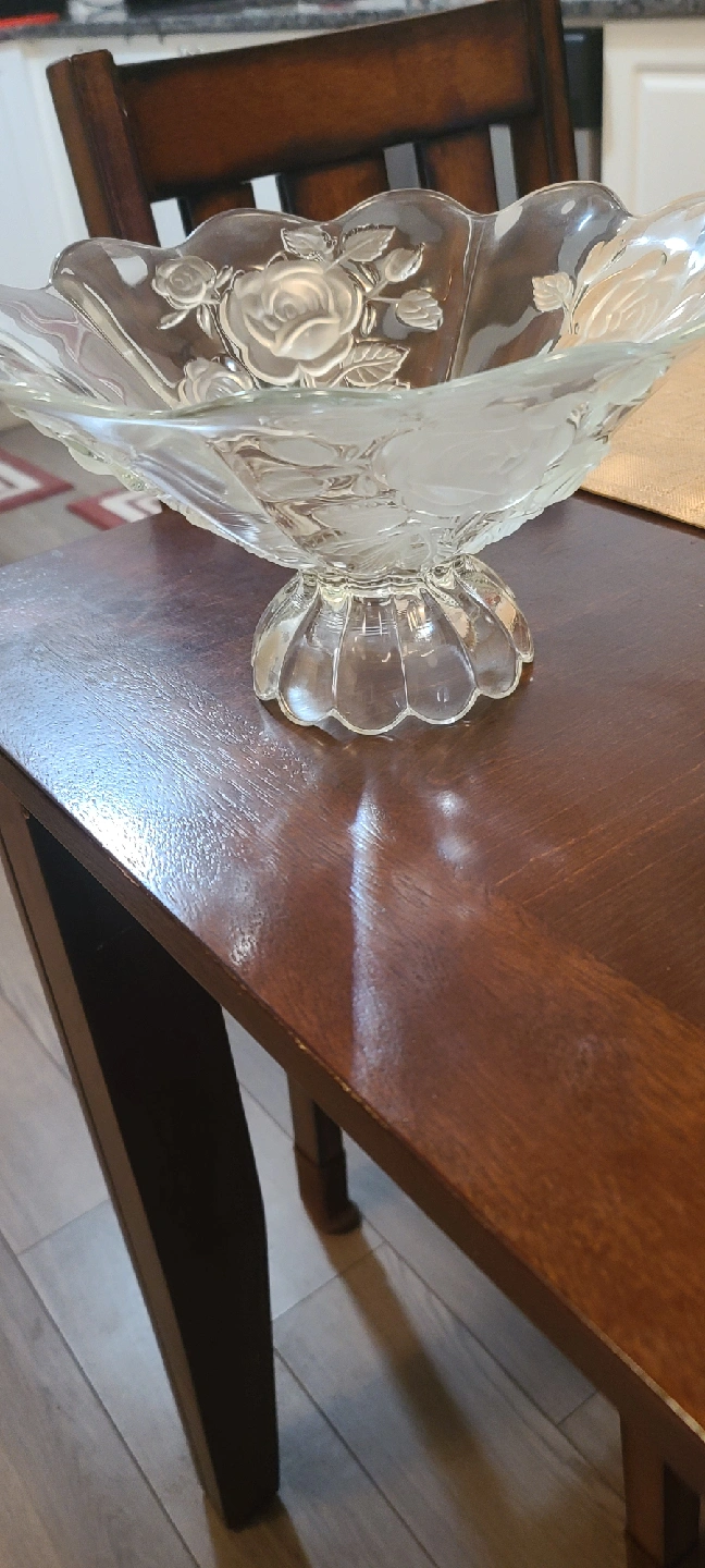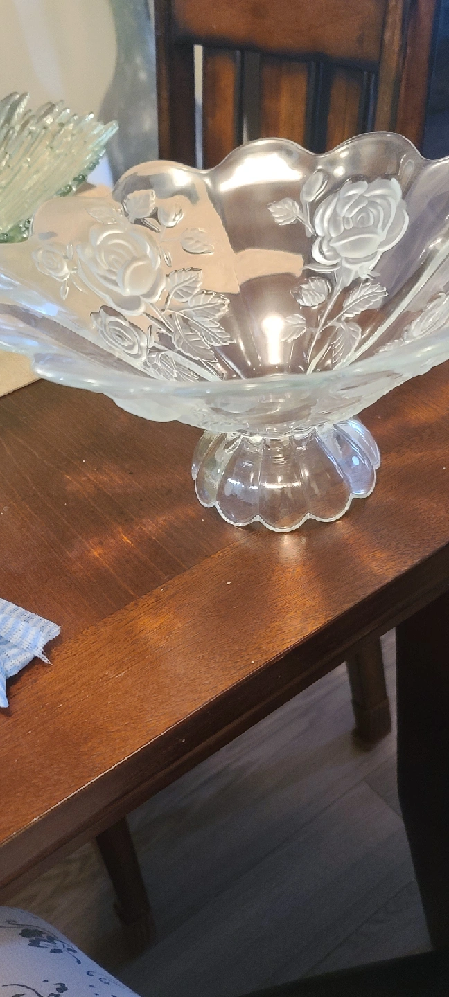 This is a beautiful clear glass bowl with a lovely floral design. It would make a wonderful centrepiece or decorative item for your home. It's in great condition and ready to add a touch of elegance to any room