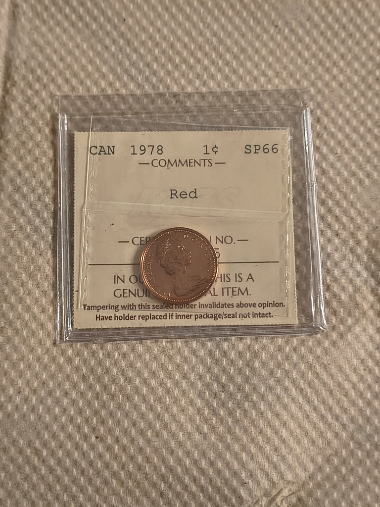 Selling a 1978 Canadian penny certified by ICCS (International Coin Certification Service). It's graded SP66 and comes in a protective case. A great addition to any coin collection!