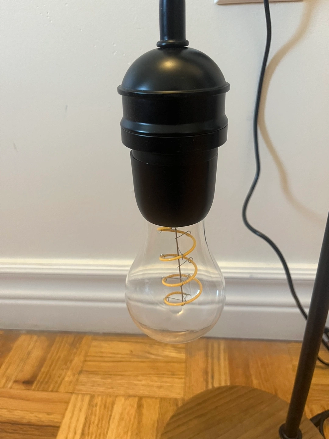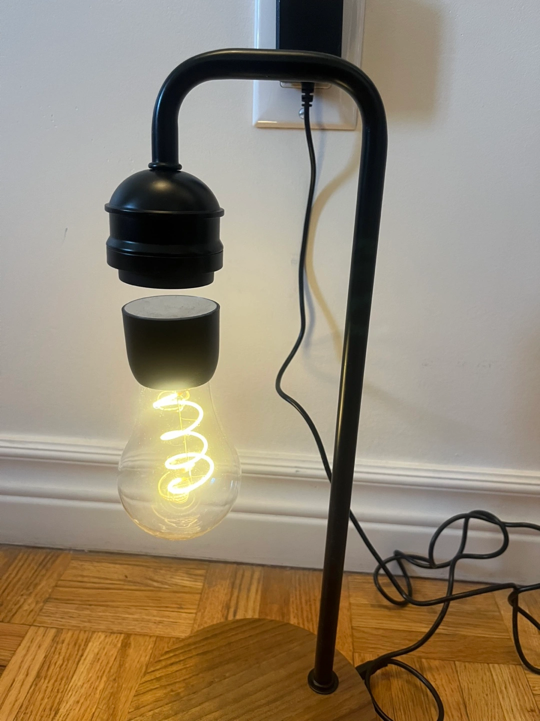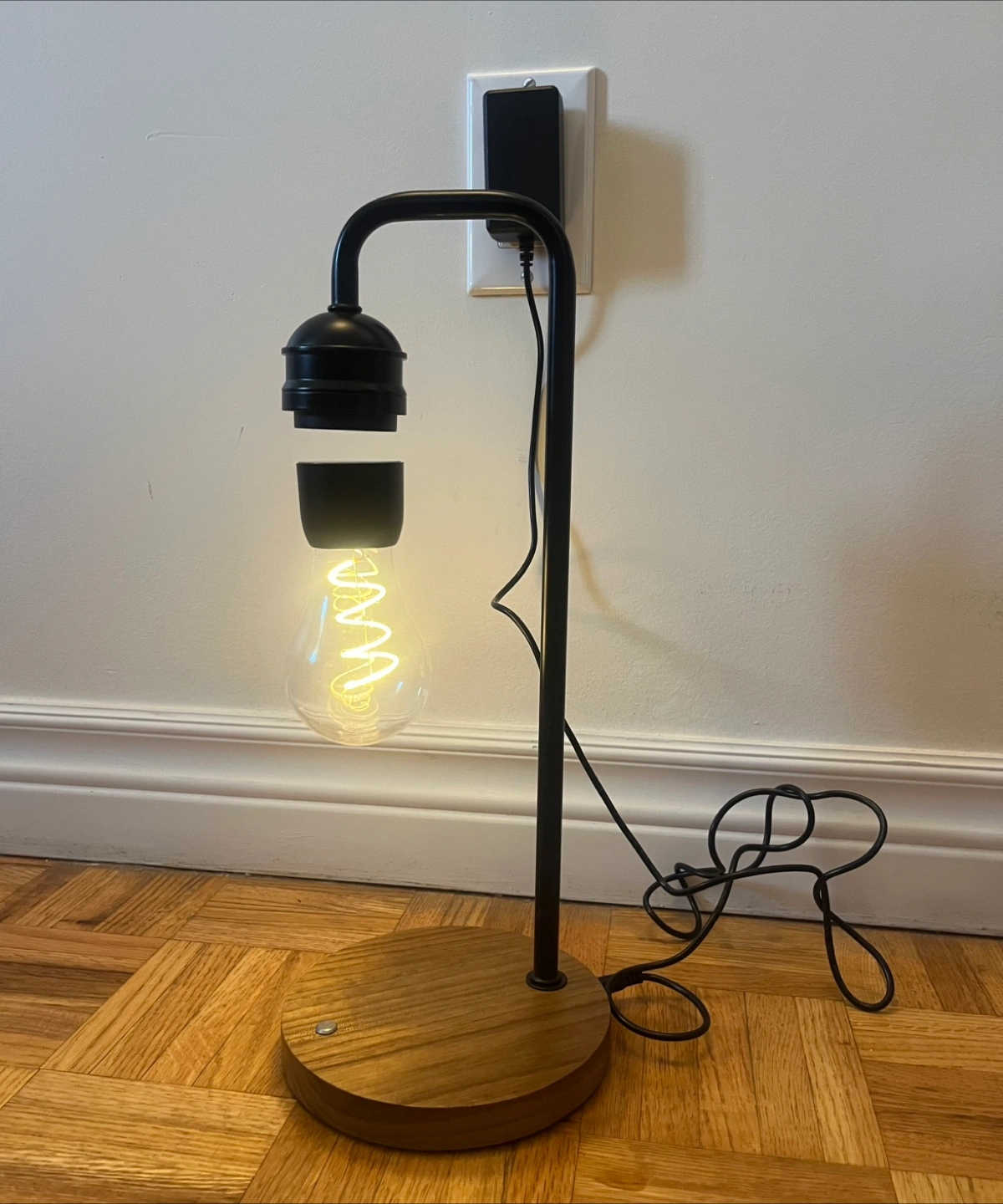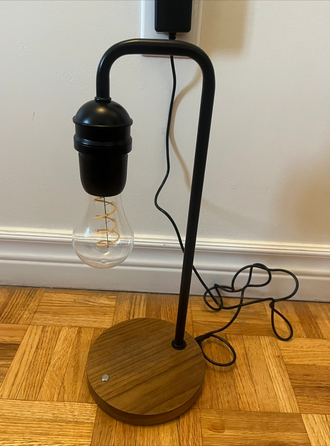 Cool levitating light bulb desk lamp! It adds a unique touch to any room. The base is a nice wood finish, and the light bulb gives off a warm glow.Cash only
