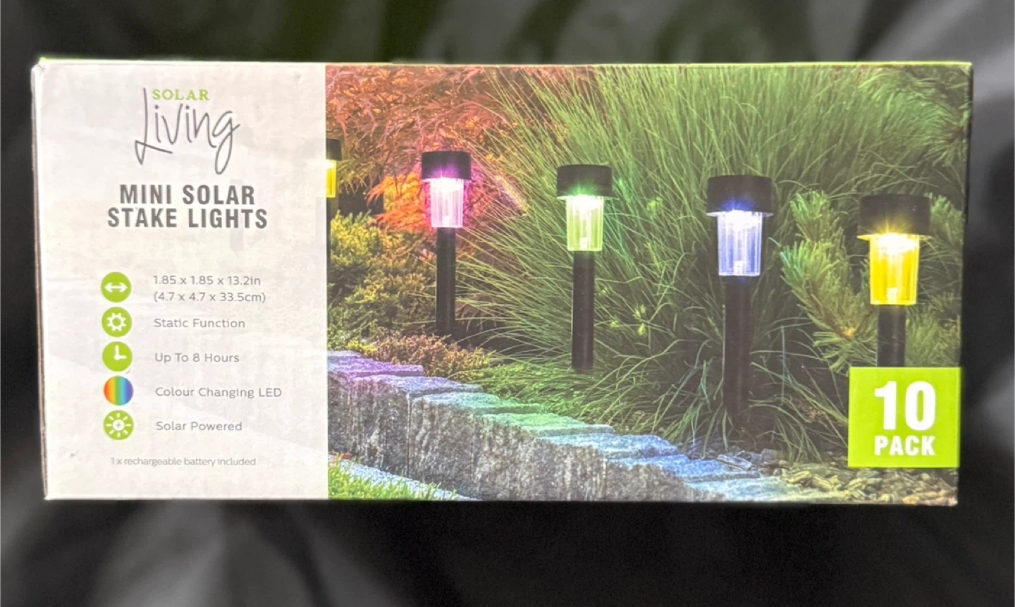 450Selling a 10-pack of Solar Living mini solar stake lights. These lights feature colour-changing LEDs and are solar-powered, so no wiring is needed! Each light has a rechargeable battery included. They can last up to 8 hours on a full charge and have a static function. Dimensions are 1.85 x 1.85 x 13.2 inches.