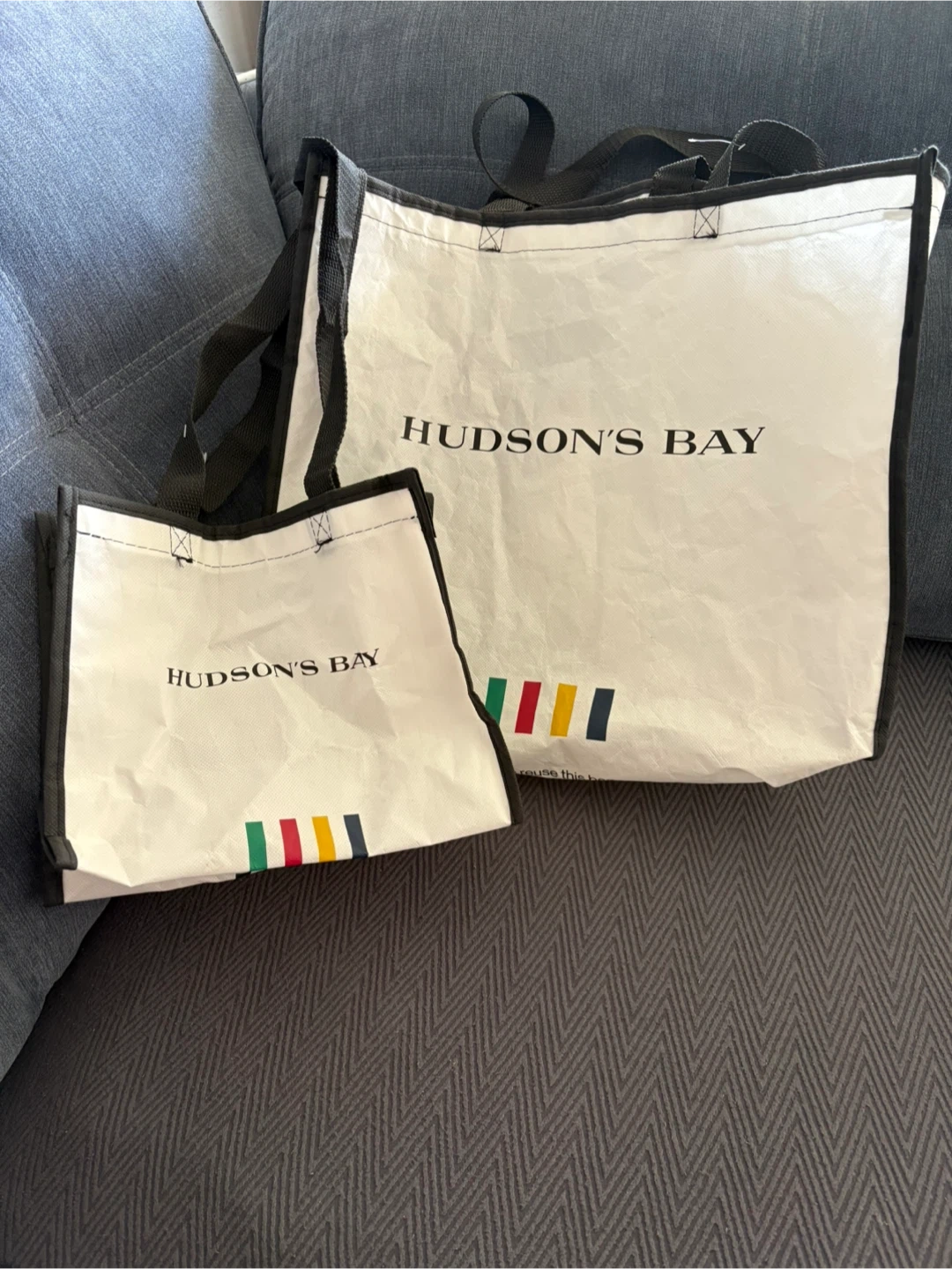 Selling a set of two Hudson's Bay tote bags! They're in great condition and perfect for shopping or carrying everyday items. One is larger, and the other is smaller, great for different needs
