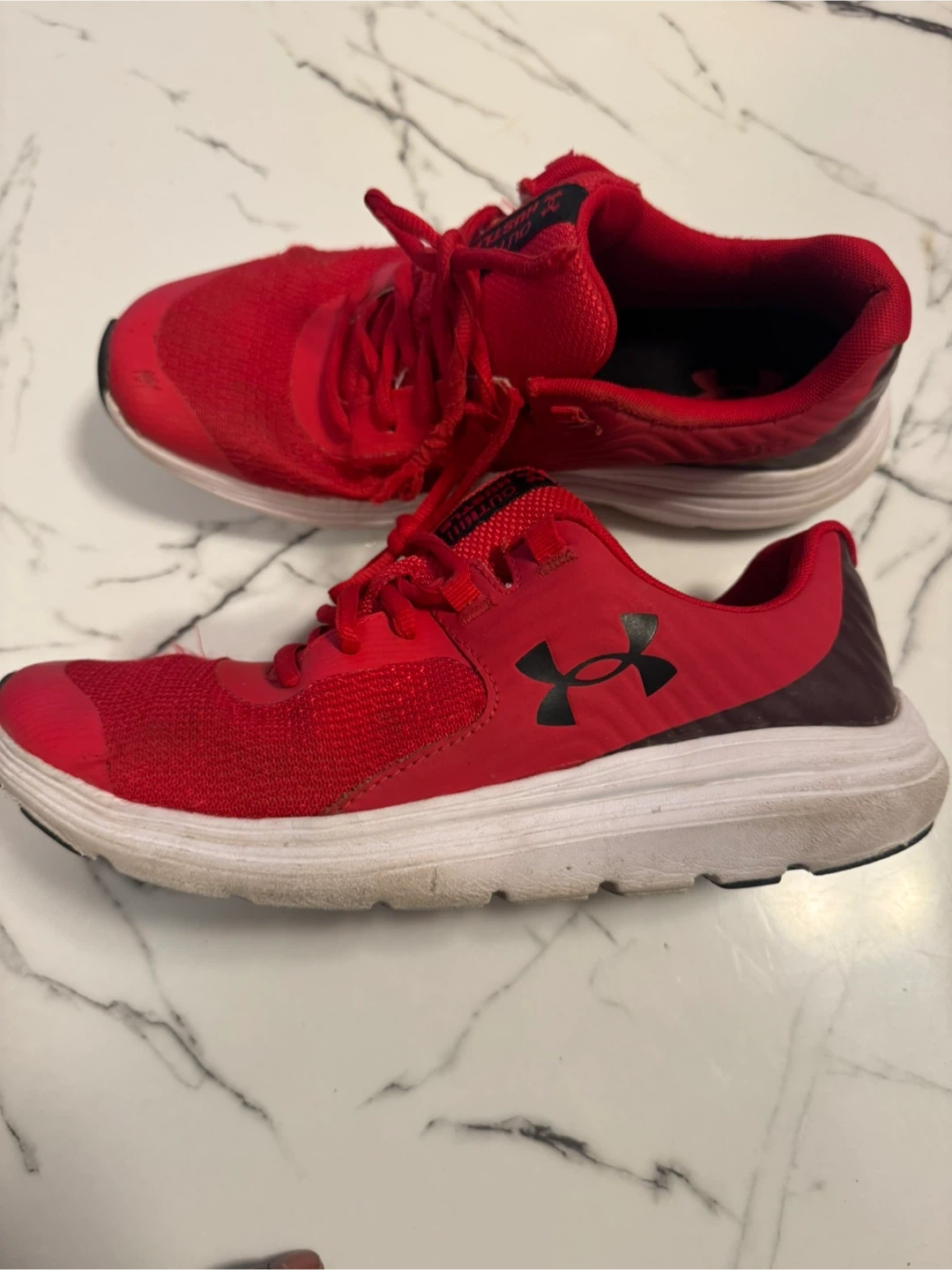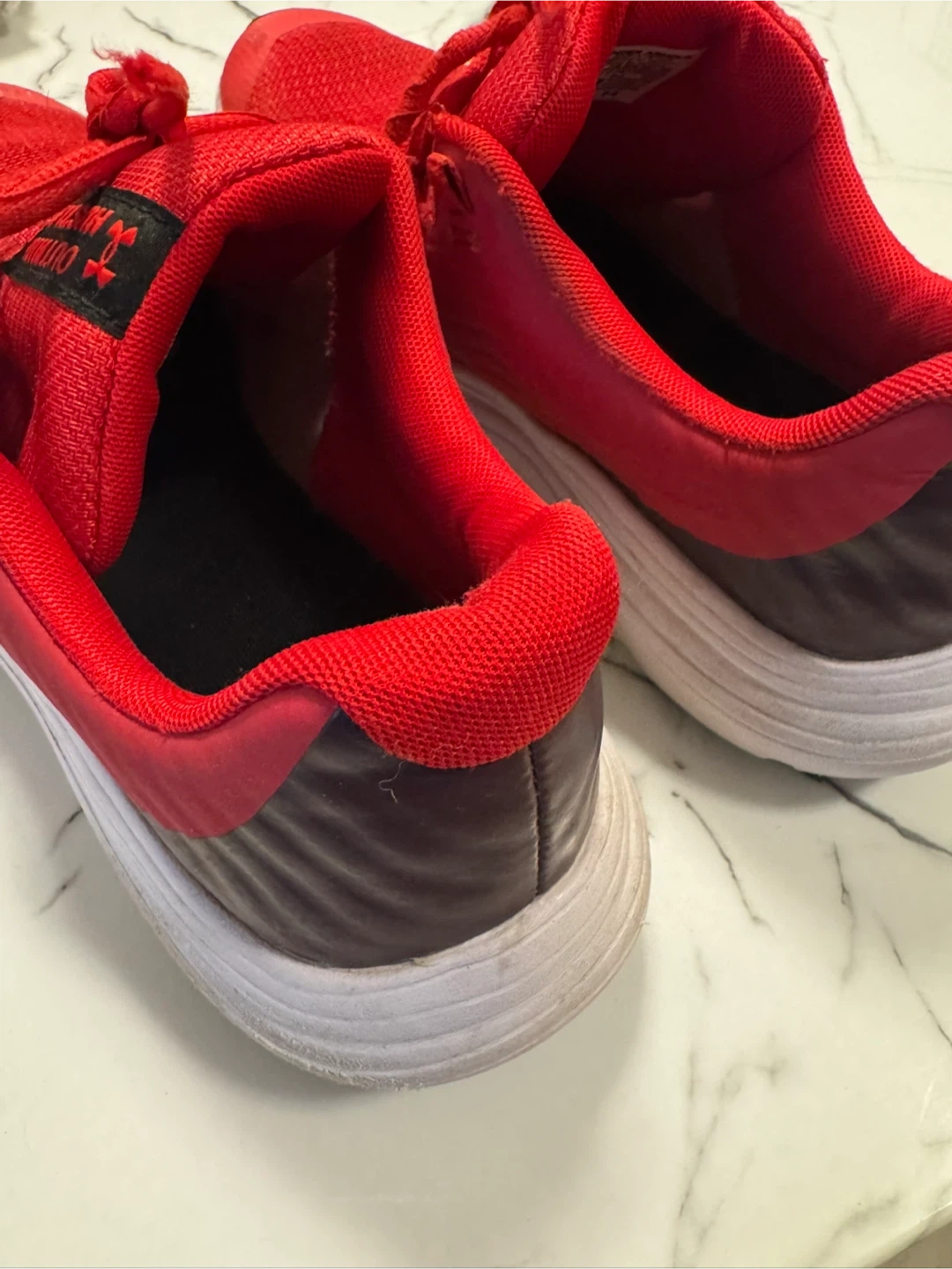Selling a pair of Under Armour Hustle running shoes in red. They have some signs of wear, but still have lots of life left in them! Great for running or everyday wear. Shoelaces will need to be replaced.