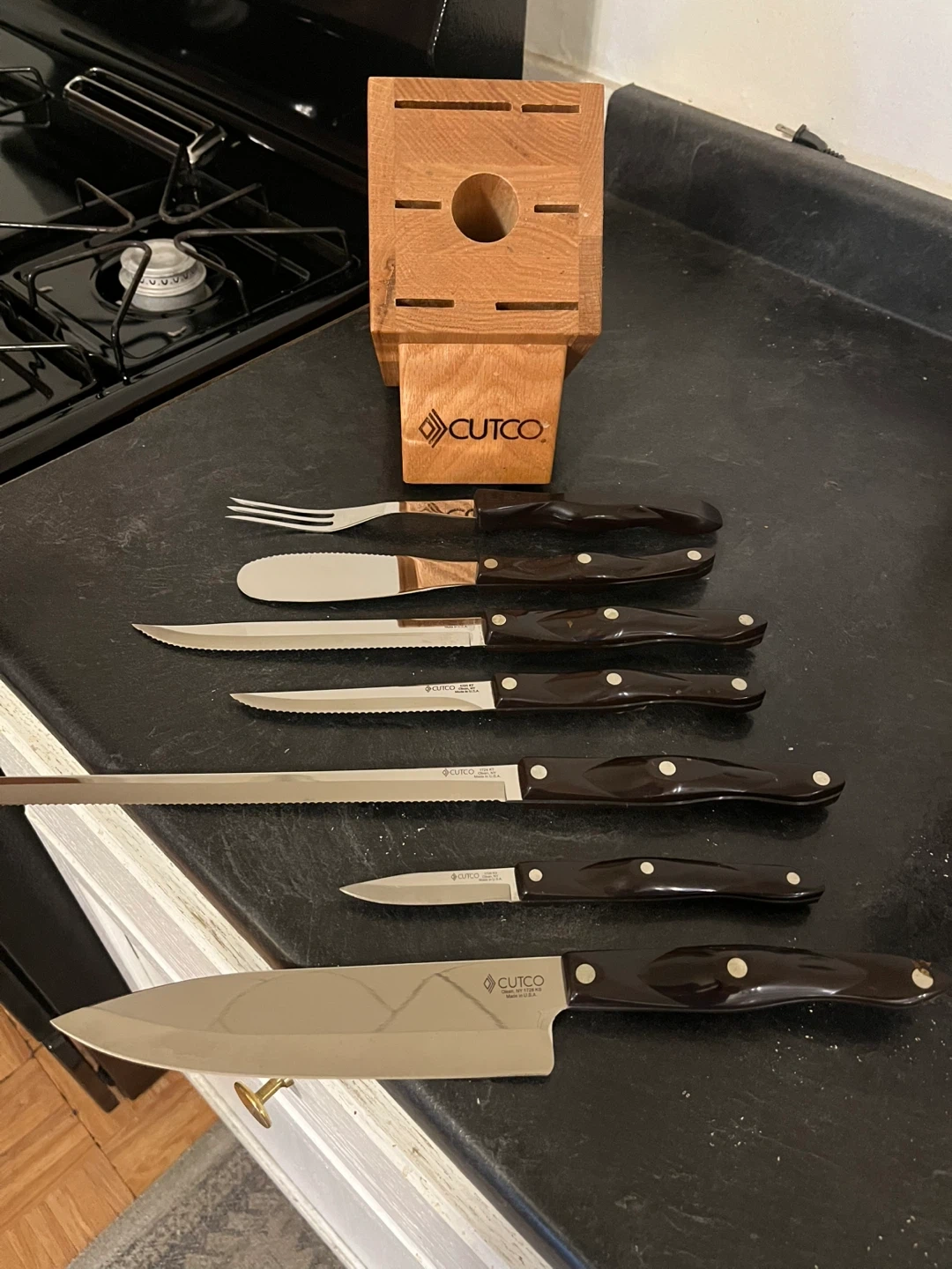 Selling a Cutco knife set, complete with a wooden block. The set includes a variety of knives for different purposes. All knives are brand new and have never been used. They have a lifetime warranty. I paid over $800 for these. Ready for a new home!