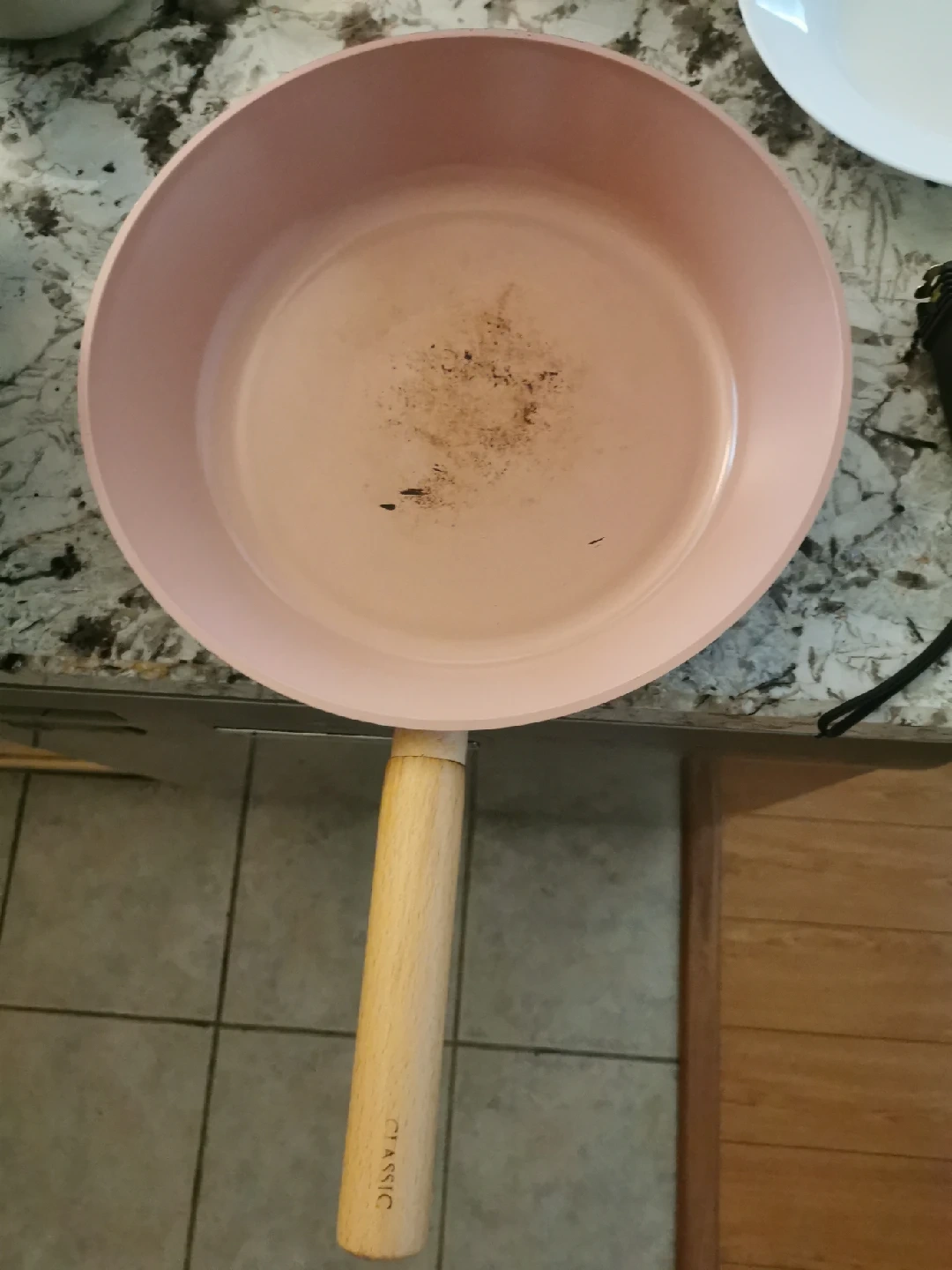 Selling a used frying pan. It's pink with a wooden handle that says 'Classic'. Showing some signs of use.