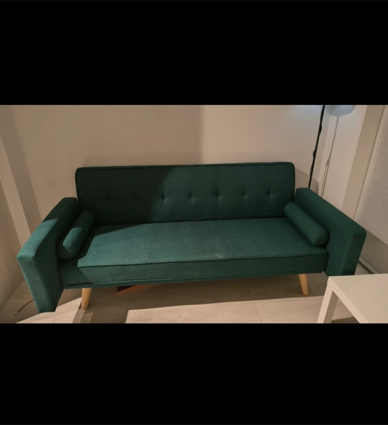 Selling a green futon sofa bed! It's in great shape! The sofa easily converts into a bed for guests. It's a stylish and functional piece of furniture!