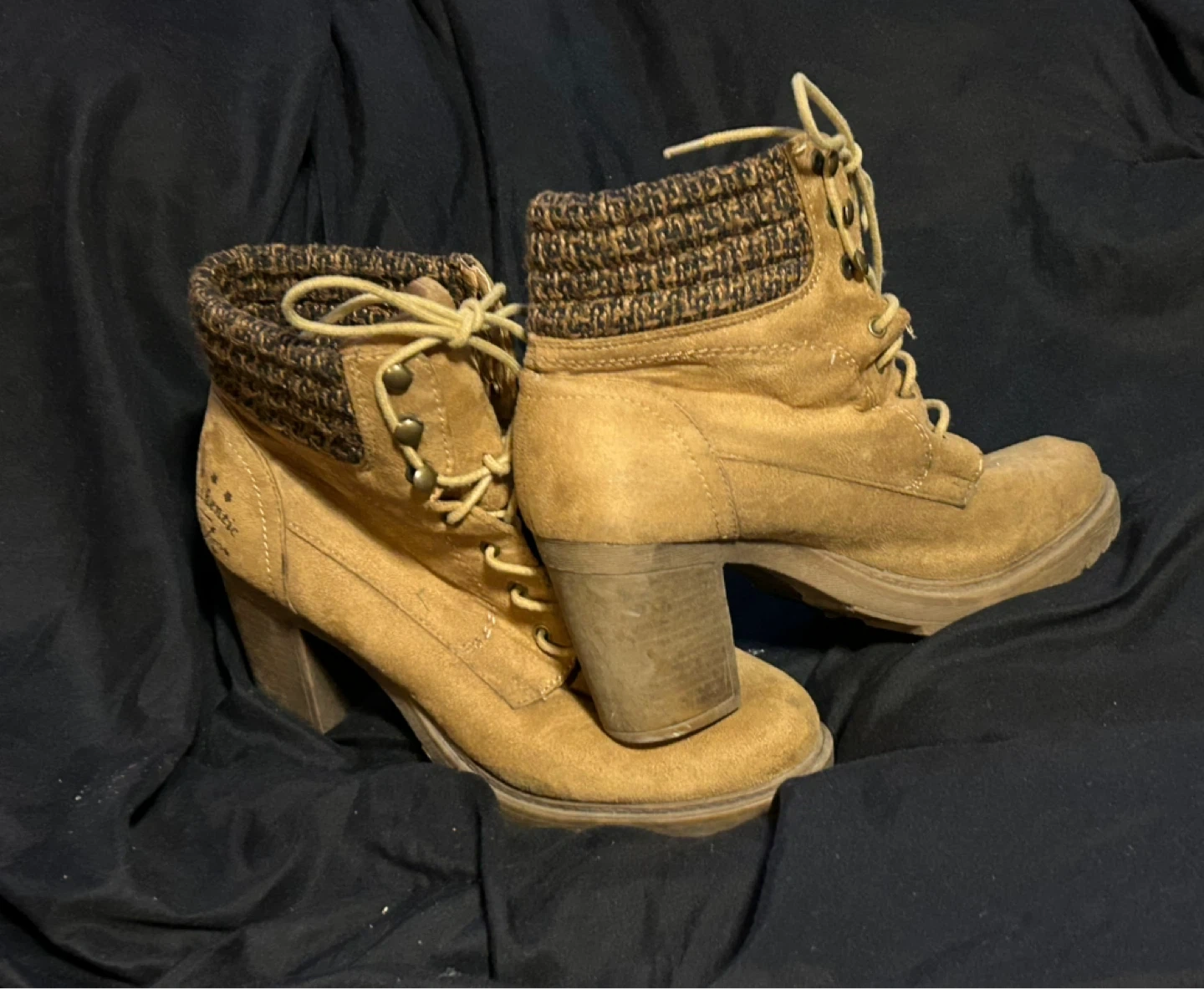 10Selling a pair of rustic ankle boots, perfect for adding a touch of style to your outfit! They are size 8 and feature a cute knit detail around the ankle. These boots have a comfortable heel height and lace-up design.