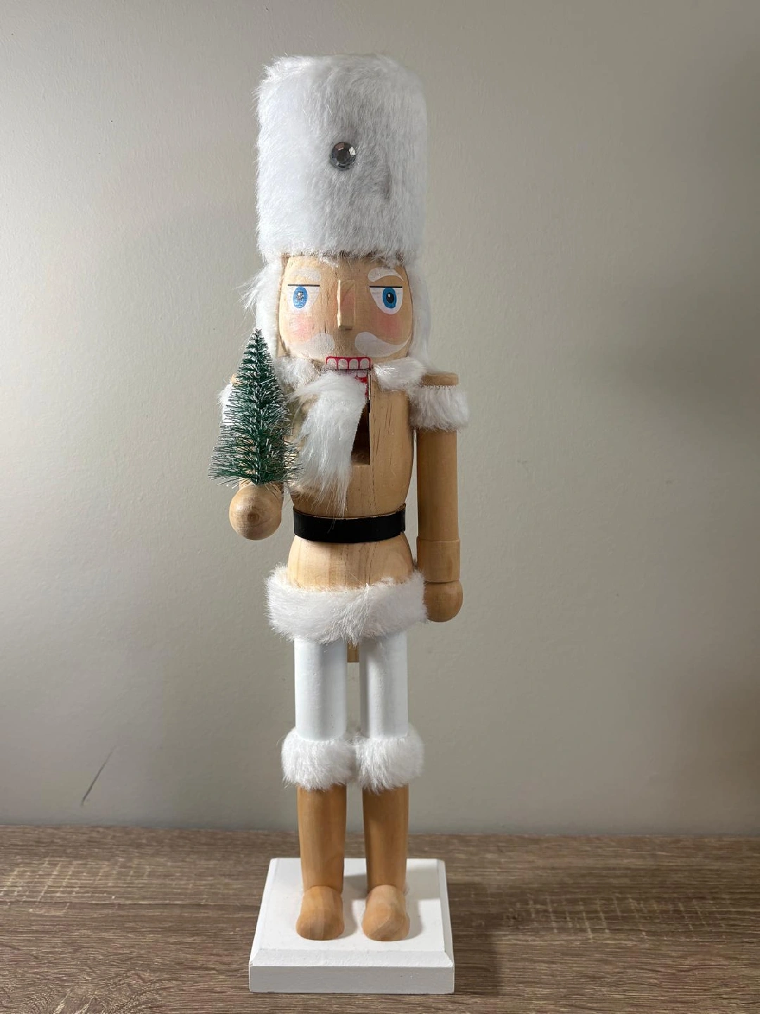 Here's a cute wooden nutcracker figure holding a small Christmas tree! It's in great shape and ready to add some holiday cheer to your home. The nutcracker has a white faux fur hat and trim, with painted details.