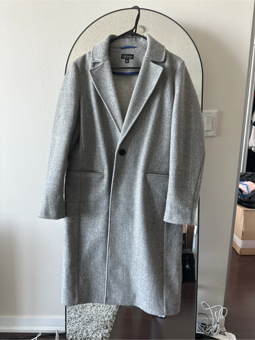 Selling a lovely Topshop coat in a light grey colour! It's a polyester, wool blend and super cozy for the cooler weather. The size is US 6 / UK 10 / EUR 38. It's in great condition and ready for a new home!