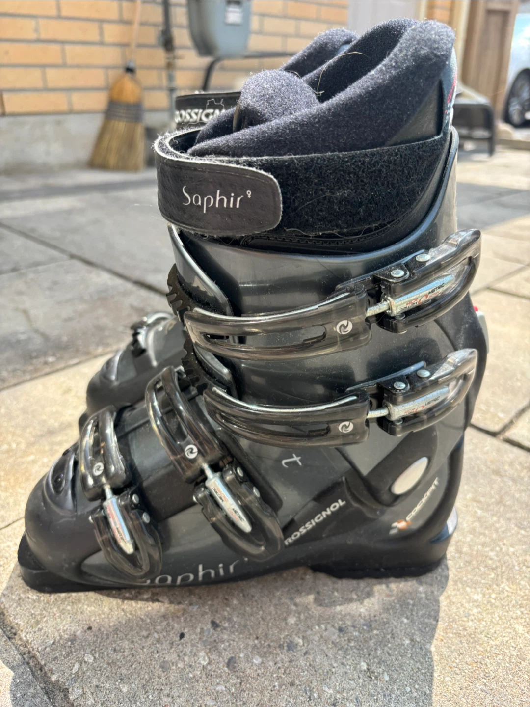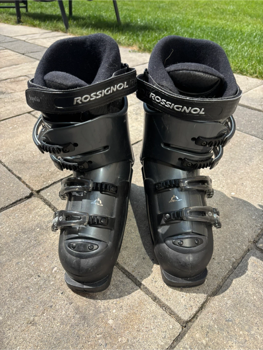 Selling a pair of unused women Rossignol Saphir ski boots. They are a size 23/23.5. The Rossignol Saphir is an older model ski boot that was designed for entry-level to intermediate skiers. They are generally described as forgiving and comfortable, with a narrow waist that provides good carving performance on groomed slopes, though they are not ideal for deep powder. Reviews highlight their all-mountain versatility and smooth, forgiving ride for short turns.