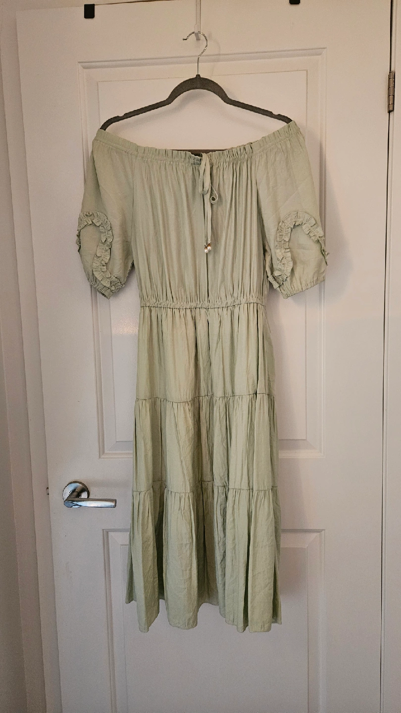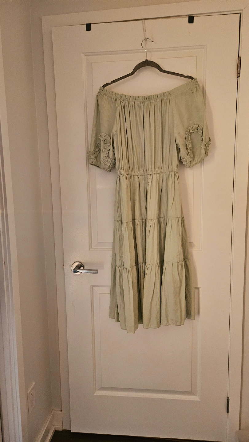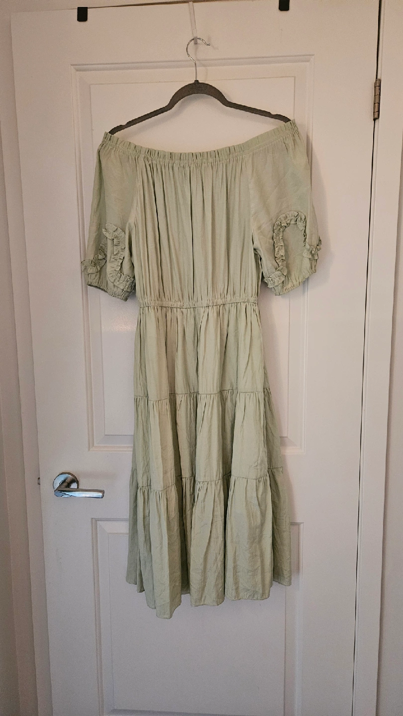 Cute sage green off-the-shoulder dress with a tiered design! It's brand new, never been used. Size Medium. Perfect for a casual day out or a fall or summer event.